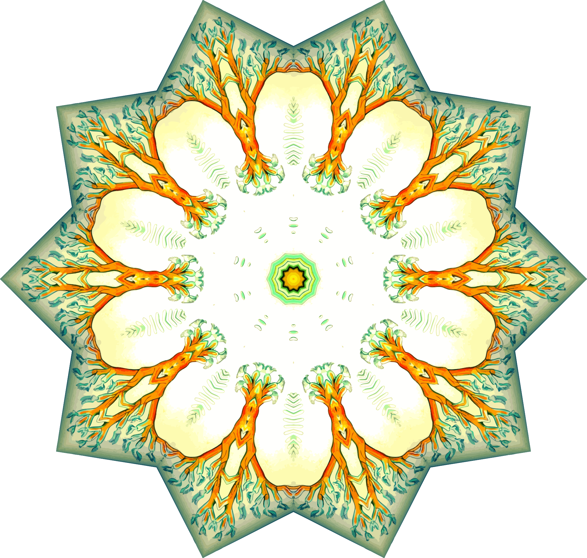 A design with approximate rotational symmetry formed from a drawing of aquatic invertebrate animals by Ernst Haeckel. The design was drawn as a PNG in Paint.net by repeated rotation of wedges of the drawing around a centre point. It was vectorized in Vector Magic
