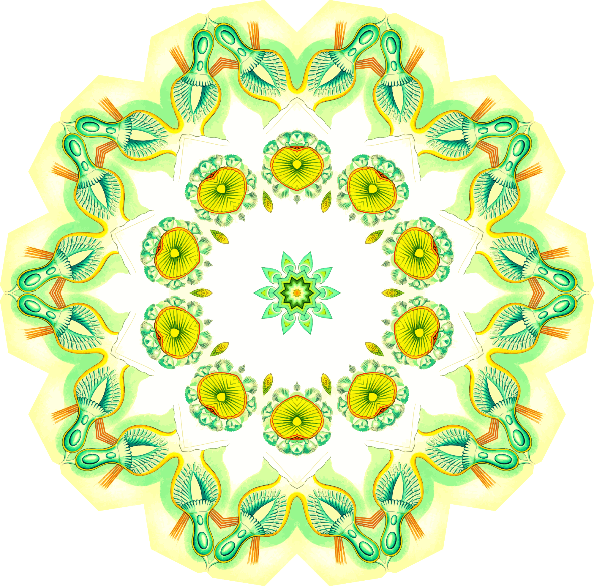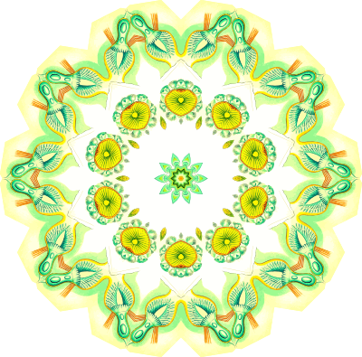 A design with approximate rotational symmetry formed from a drawing of aquatic invertebrate animals by Ernst Haeckel. The design was drawn as a PNG in Paint.net by repeated rotation of wedges of the drawing around a centre point. It was vectorized in Vector Magic