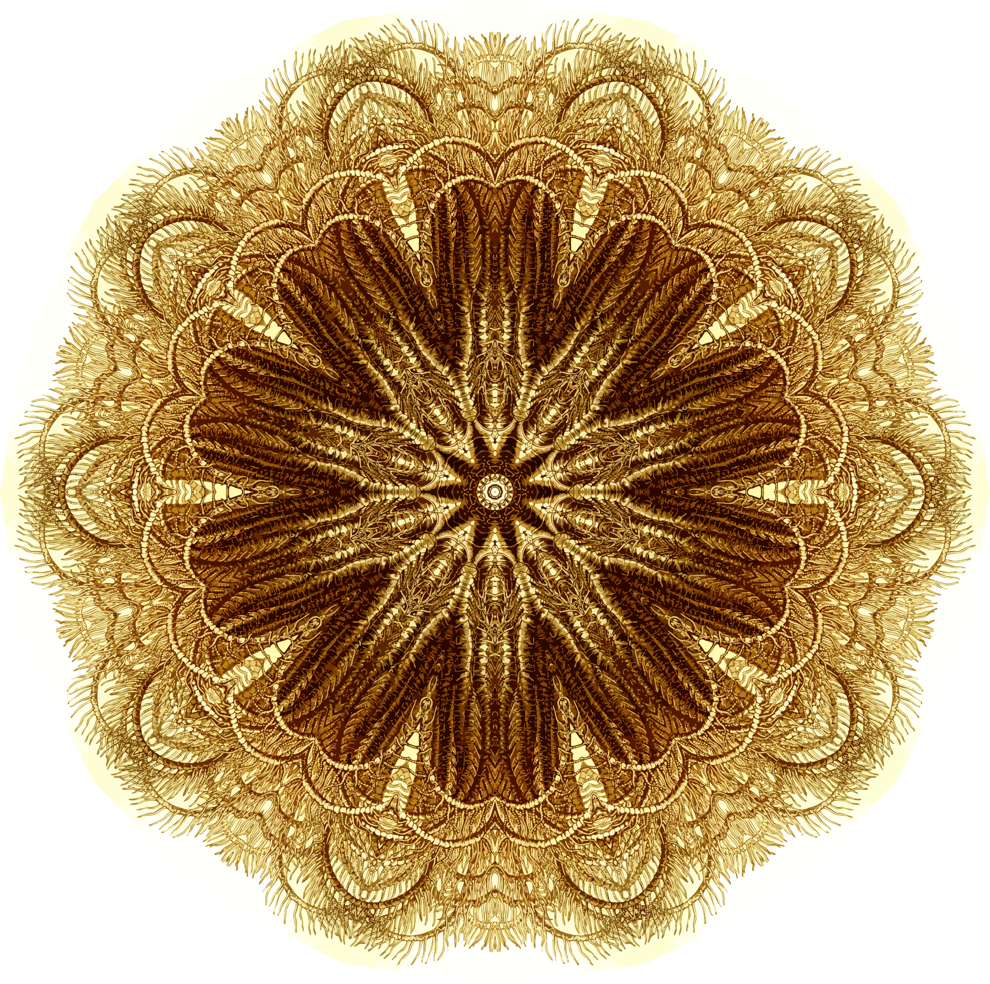 A design with approximate rotational symmetry formed from a drawing of echinoderms by Ernst Haeckel. The design was drawn as a PNG in Paint.net by repeated rotation of wedges of the drawing around a centre point. It was vectorized in Vector Magic
