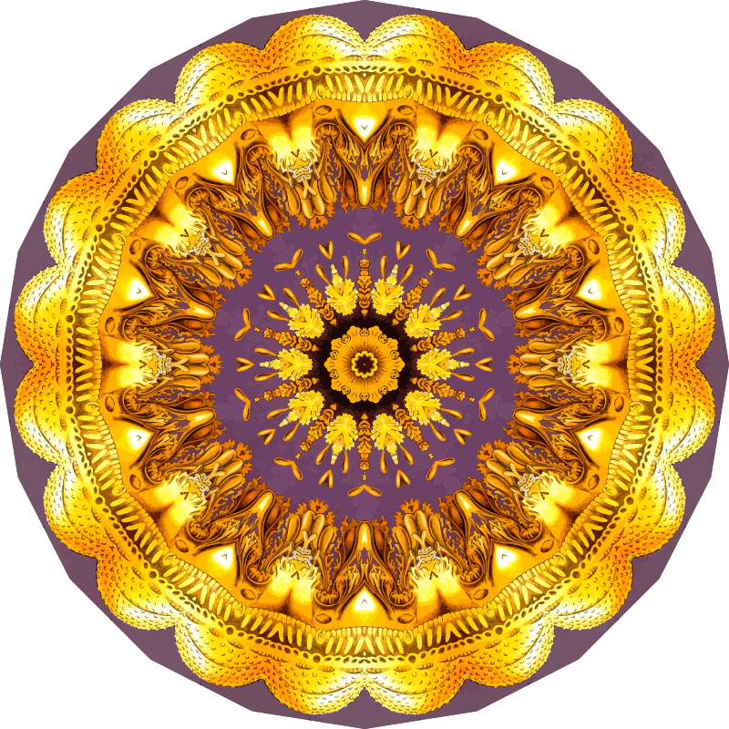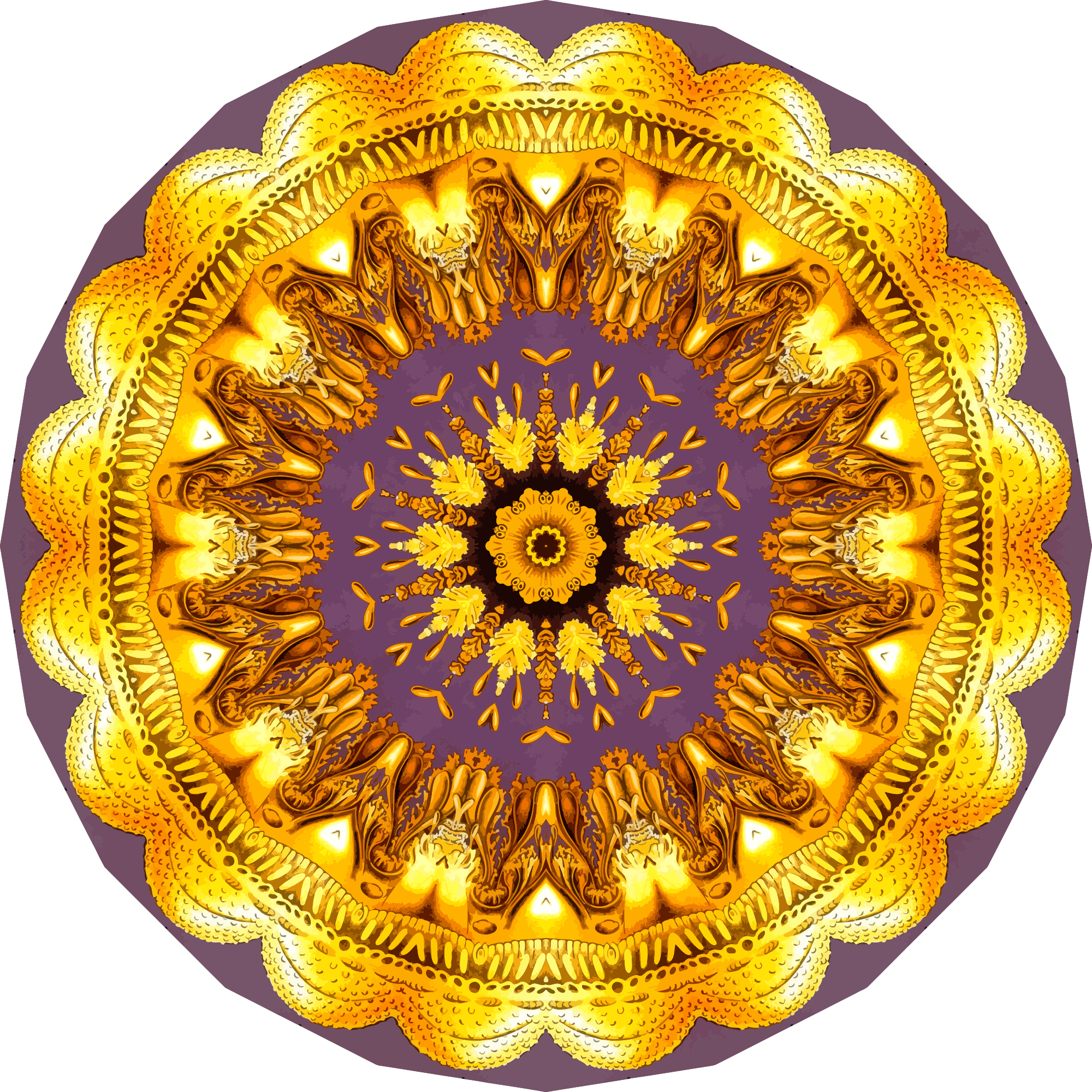 A design with approximate rotational symmetry formed from a drawing of jellyfish by Ernst Haeckel. The design was drawn as a PNG in Paint.net by repeated rotation of wedges of the drawing around a centre point. It was vectorized in Vector Magic