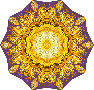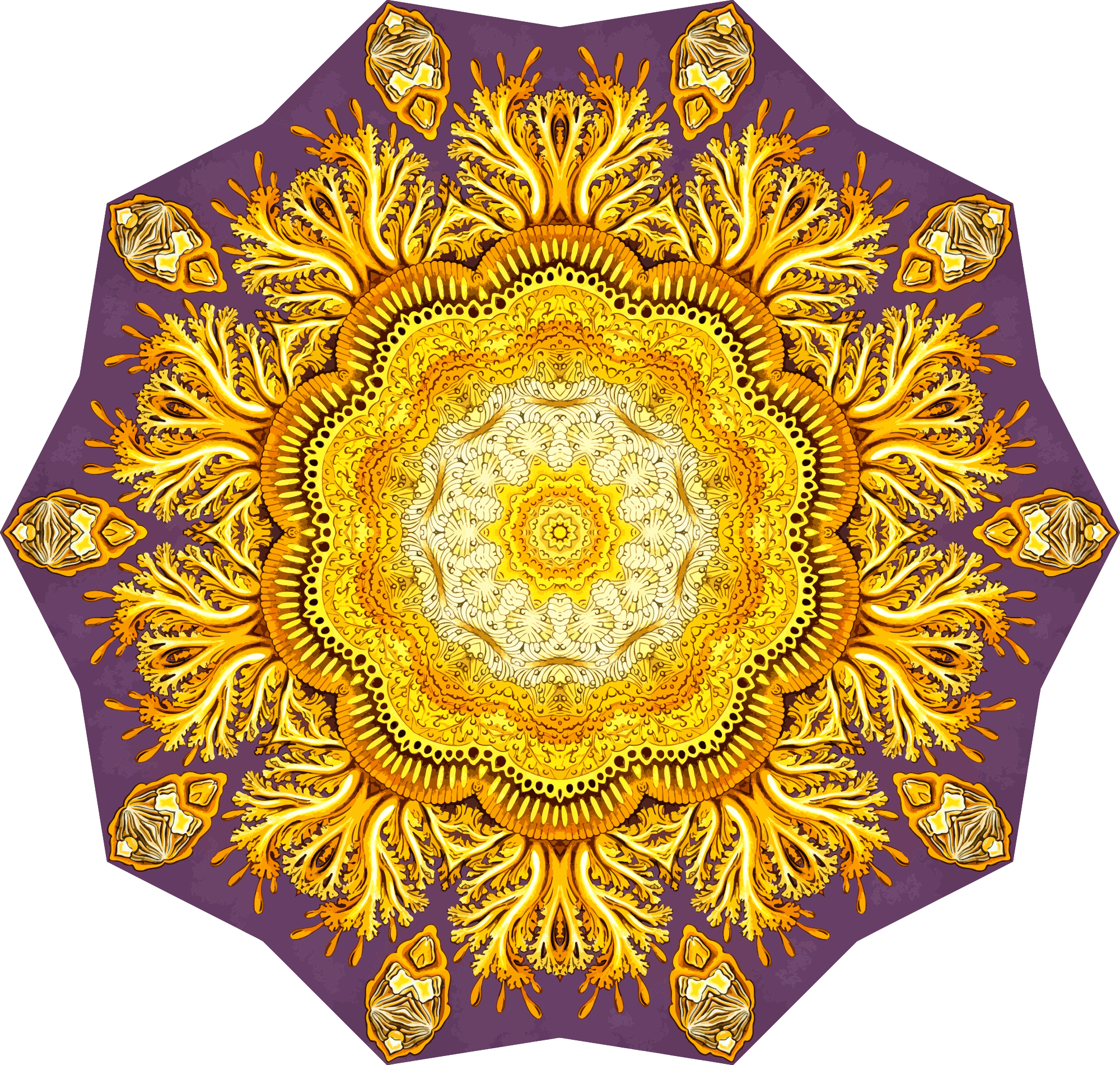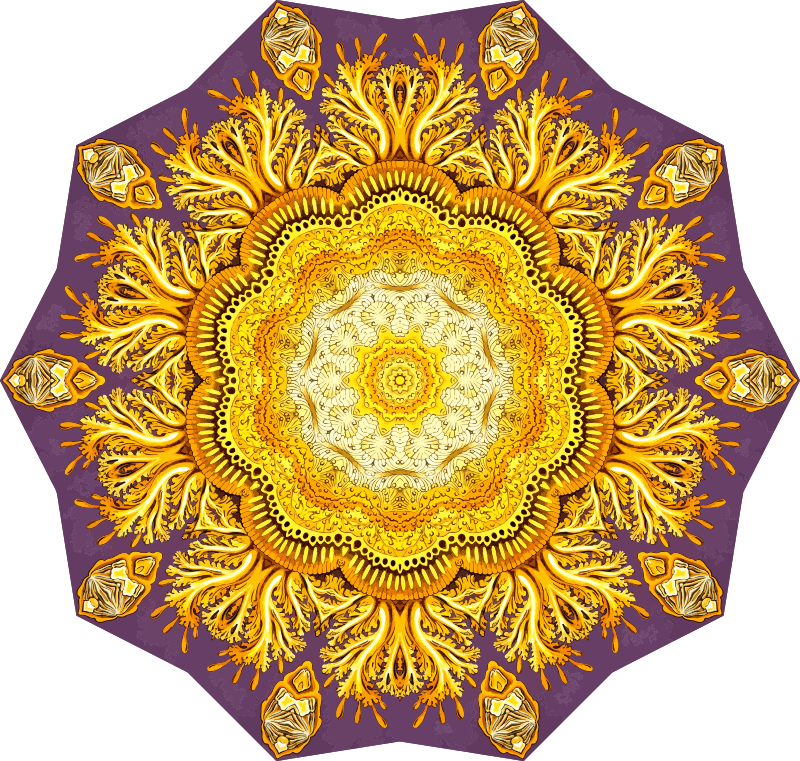 A design with approximate rotational symmetry formed from a drawing of jellyfish by Ernst Haeckel. The design was drawn as a PNG in Paint.net by repeated rotation of wedges of the drawing around a centre point. It was vectorized in Vector Magic
