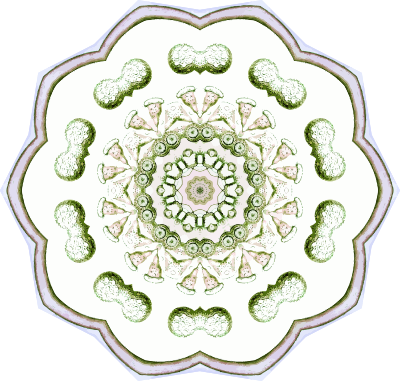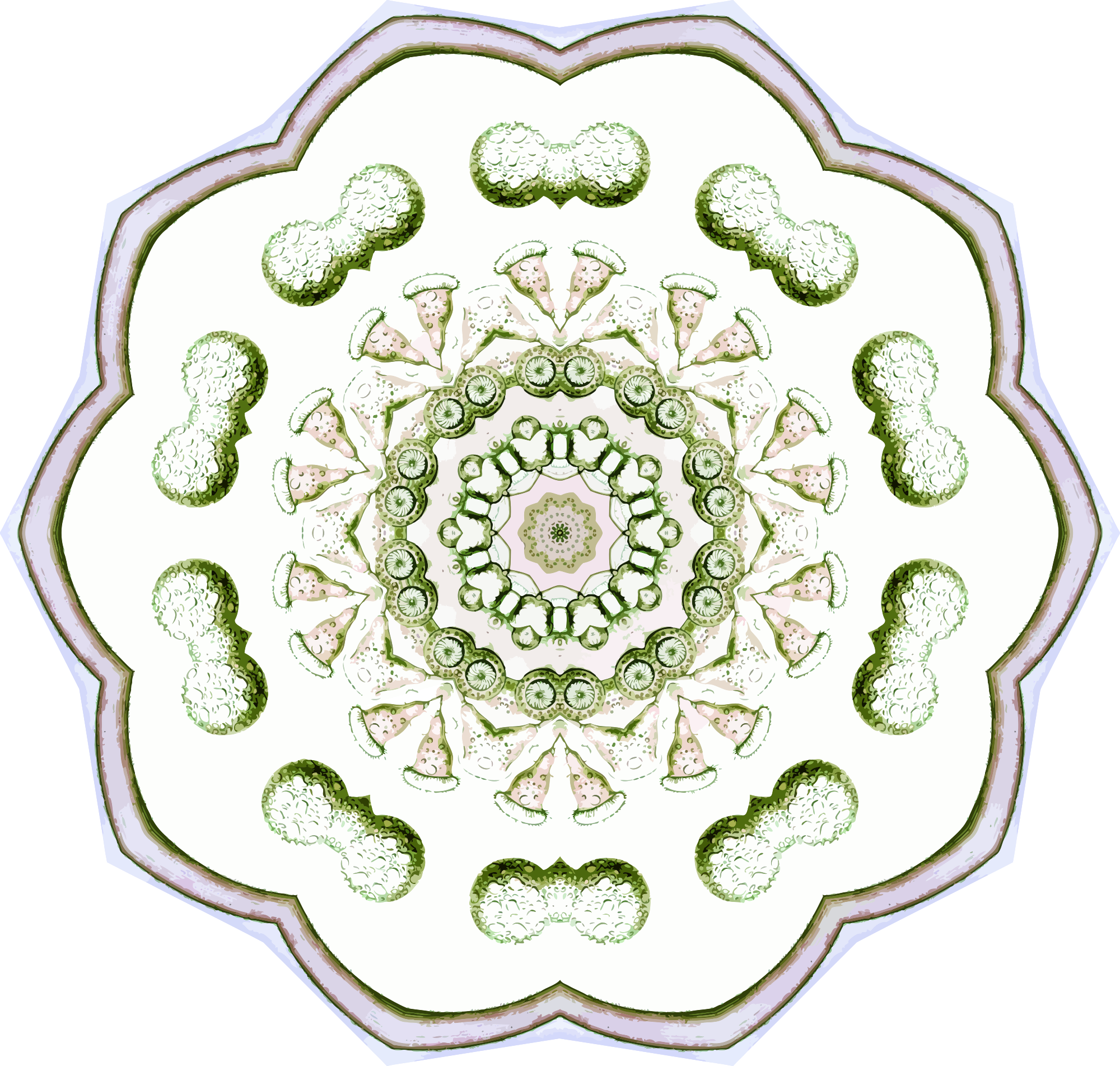 A design with approximate rotational symmetry formed from a drawing of protozoans by Ernst Haeckel. The design was drawn as a PNG in Paint.net by repeated rotation of wedges of the drawing around a centre point. It was vectorized in Vector Magic