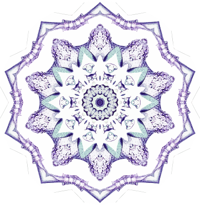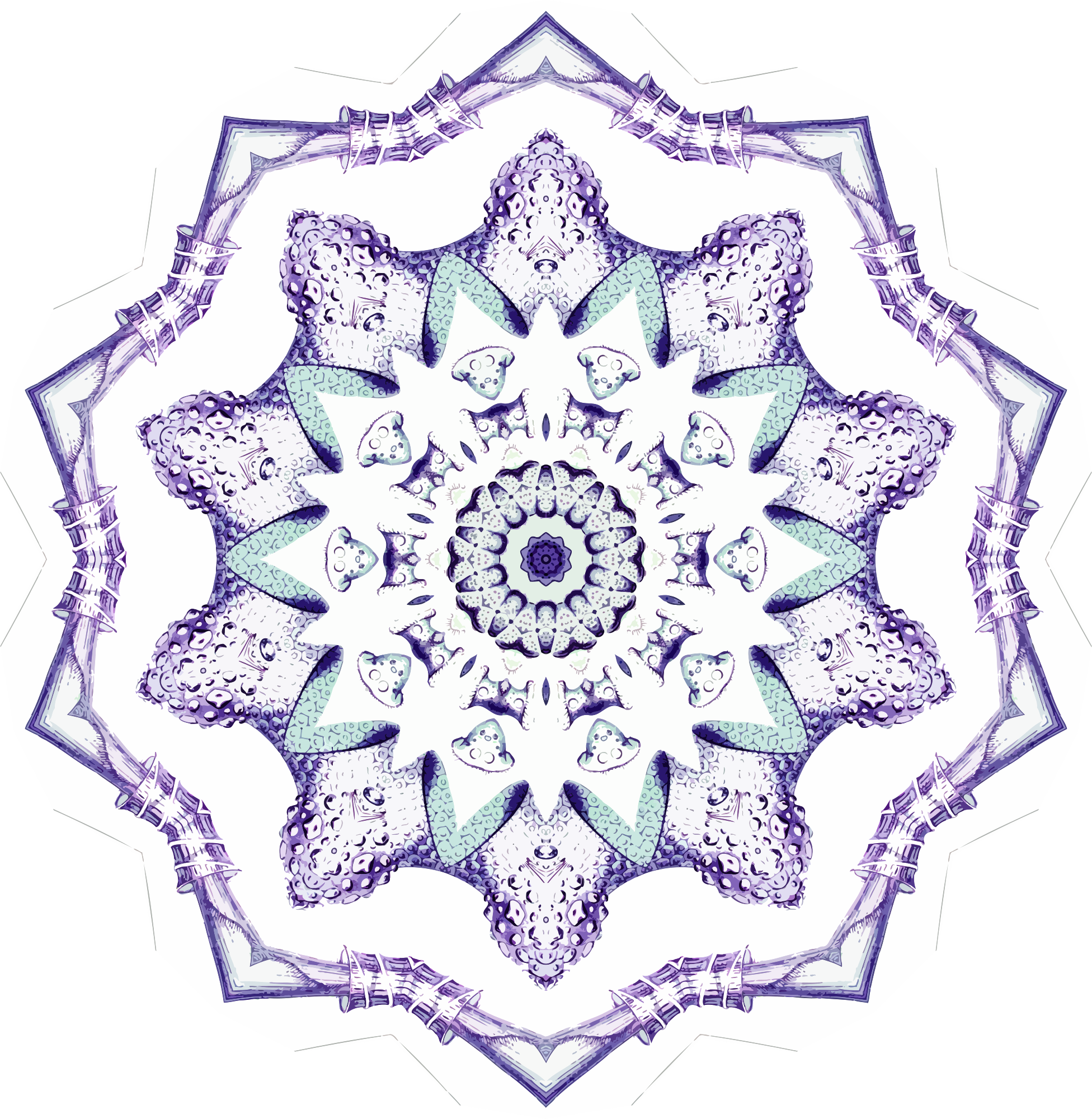 A design with approximate rotational symmetry formed from a drawing of protozoans by Ernst Haeckel. The design was drawn as a PNG in Paint.net by repeated rotation of wedges of the drawing around a centre point. It was vectorized in Vector Magic