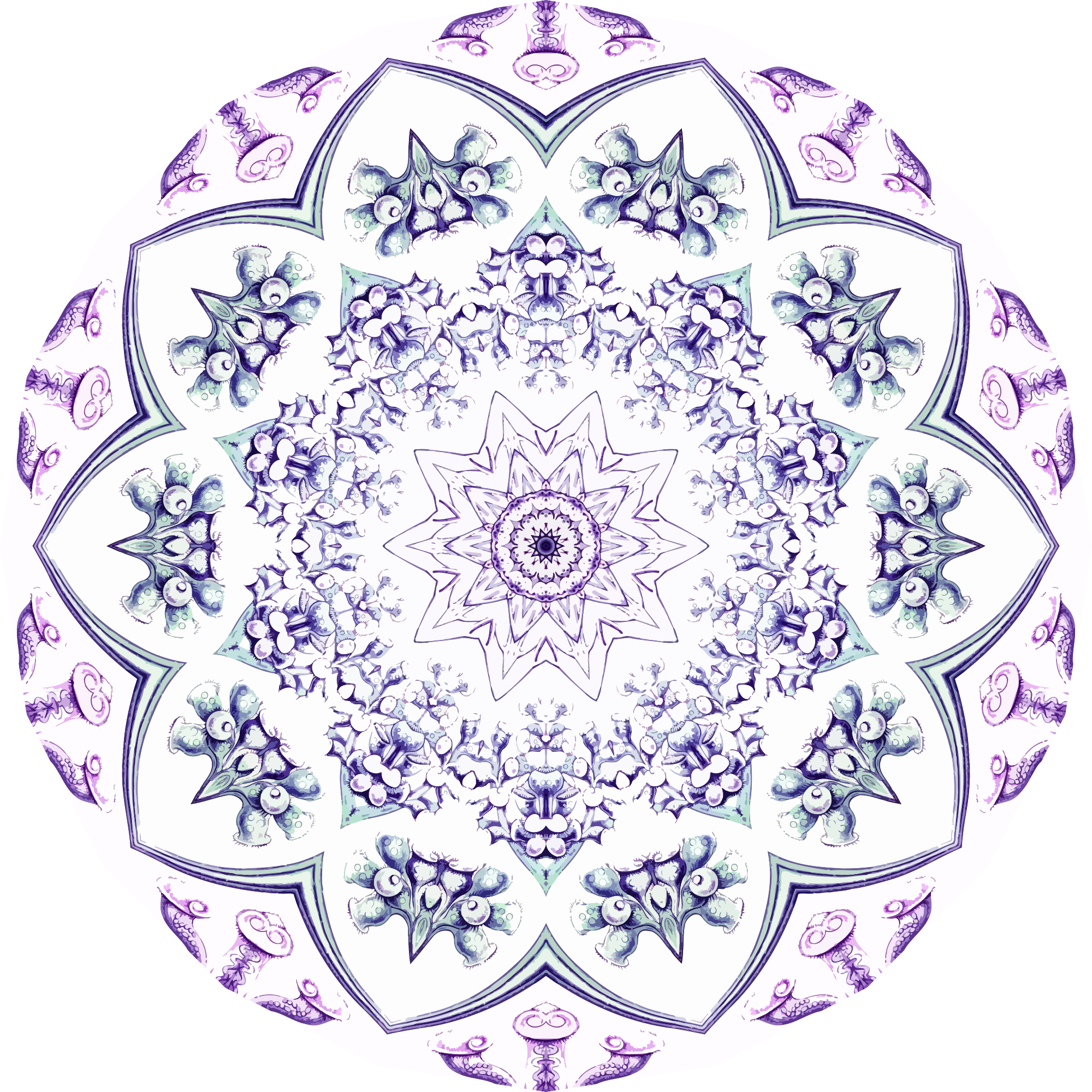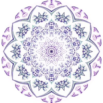 A design with approximate rotational symmetry formed from a drawing of protozoans by Ernst Haeckel. The design was drawn as a PNG in Paint.net by repeated rotation of wedges of the drawing around a centre point. It was vectorized in Vector Magic