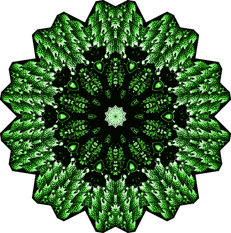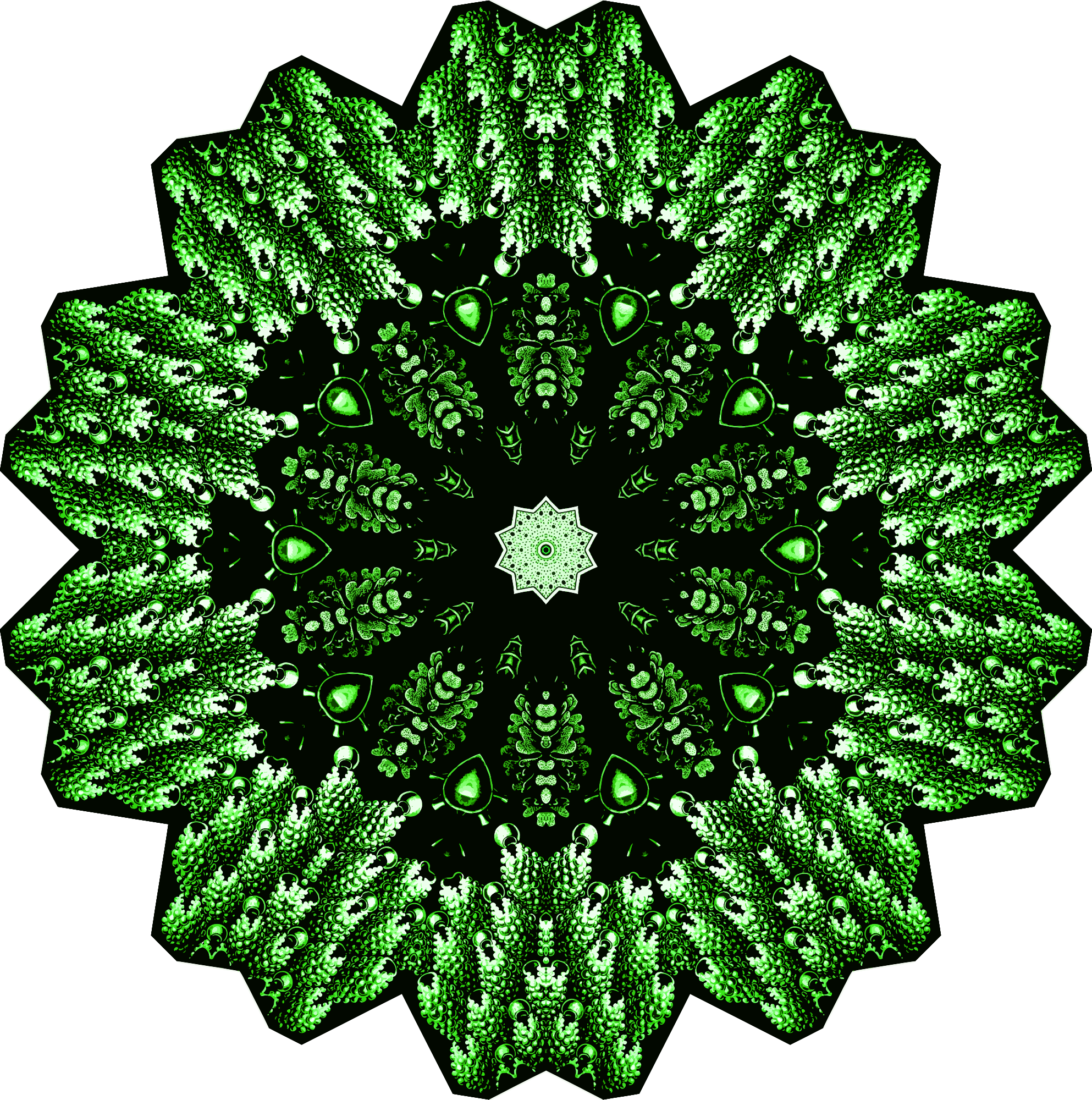 A design with approximate rotational symmetry formed from a drawing of aquatic invertebrate animals by Ernst Haeckel. The design was drawn as a PNG in Paint.net by repeated rotation of wedges of the drawing around a centre point. It was vectorized in Vector Magic