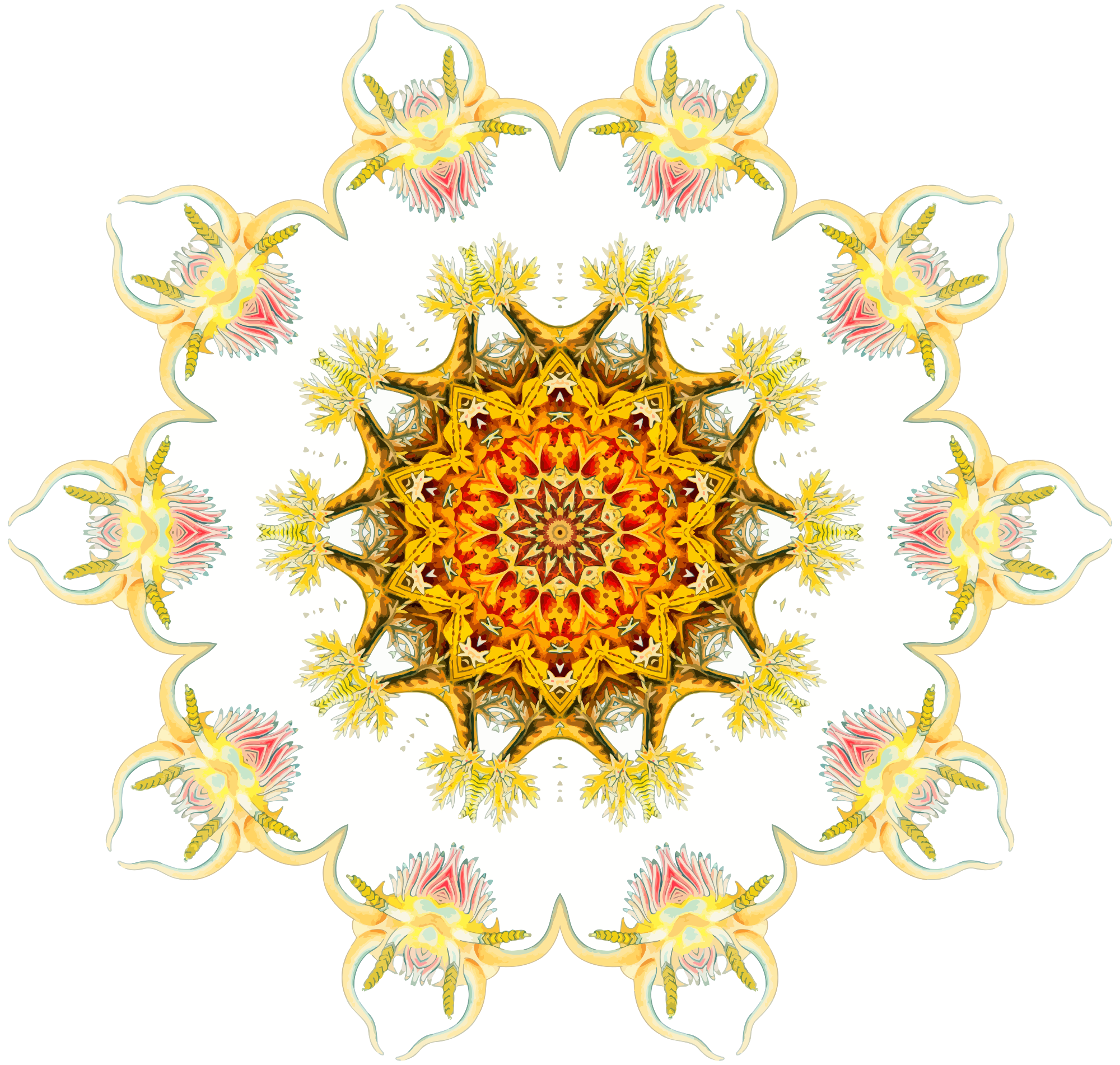 A design with approximate rotational symmetry formed from a drawing of aquatic gastropod molluscs by Ernst Haeckel. The design was drawn as a PNG in Paint.net by repeated rotation of wedges of the drawing around a centre point. It was vectorized in Vector Magic
