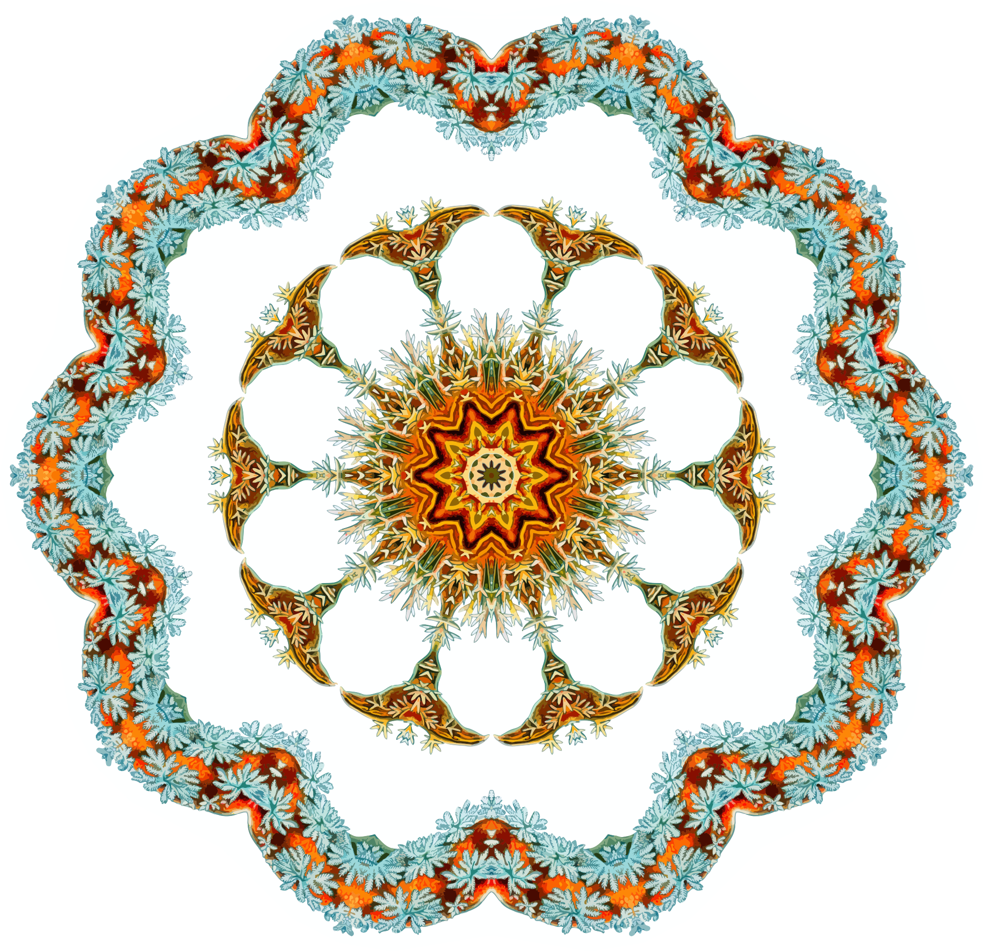 A design with approximate rotational symmetry formed from a drawing of aquatic gastropod molluscs by Ernst Haeckel. The design was drawn as a PNG in Paint.net by repeated rotation of wedges of the drawing around a centre point. It was vectorized in Vector Magic