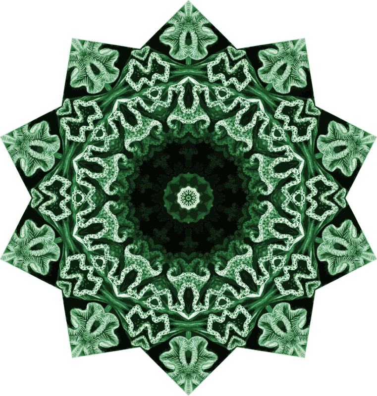 A design with approximate rotational symmetry formed from a drawing of coral by Ernst Haeckel. The design was drawn as a PNG in Paint.net by repeated rotation of wedges of the drawing around a centre point. It was vectorized in Vector Magic