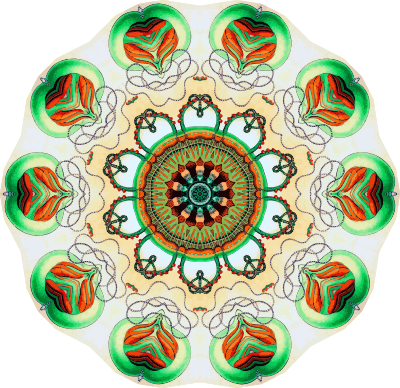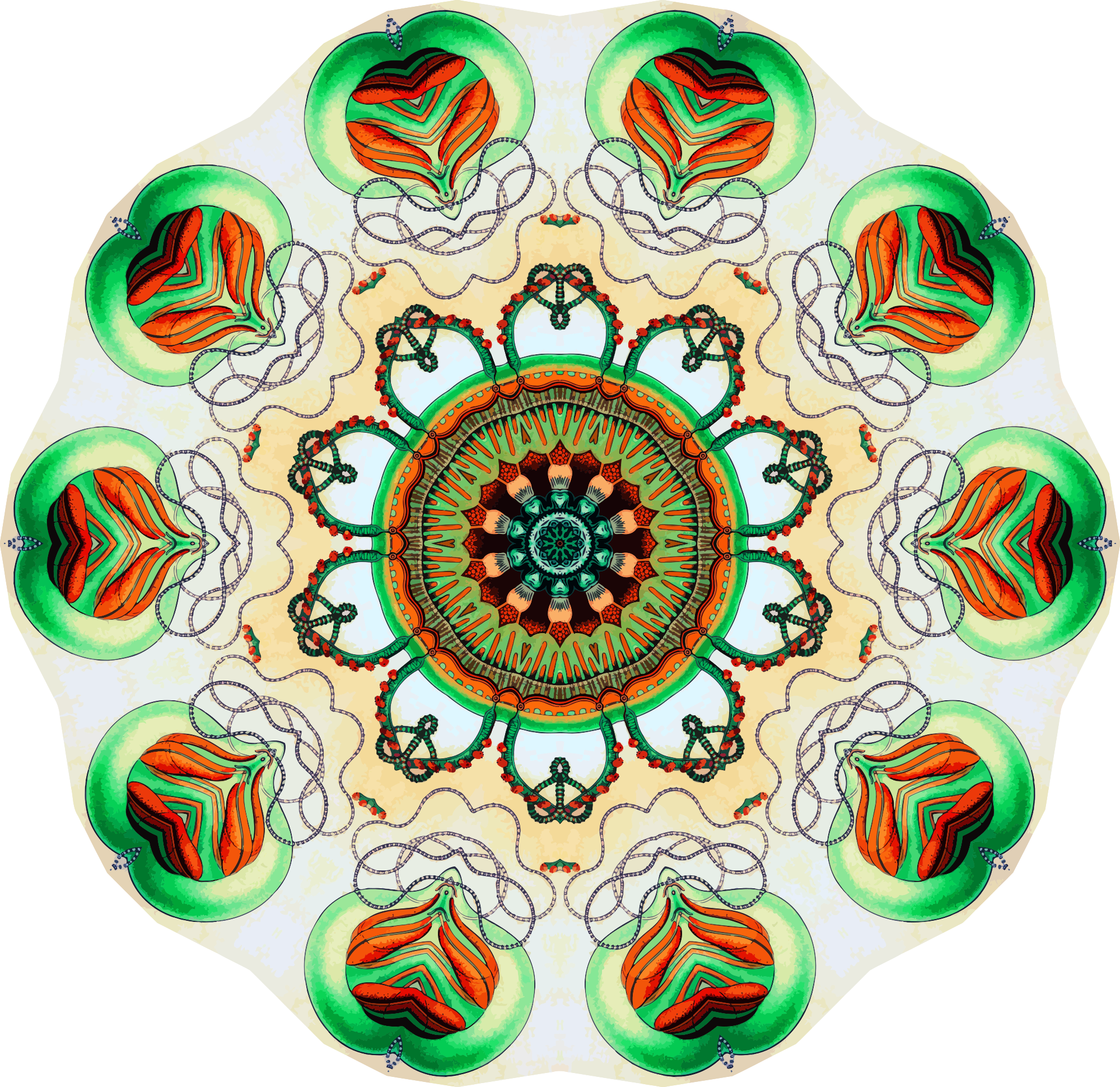 A design with approximate rotational symmetry formed from a drawing of marine coelenterates by Ernst Haeckel. The design was drawn as a PNG in Paint.net by repeated rotation of wedges of the drawing around a centre point. It was vectorized in Vector Magic