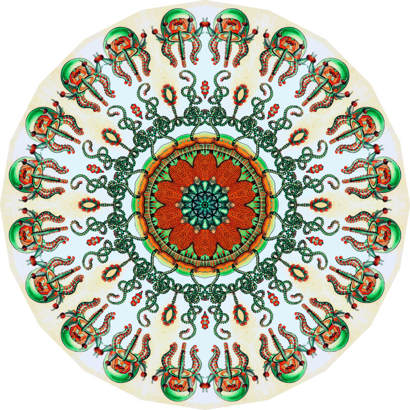 A design with approximate rotational symmetry formed from a drawing of marine coelenterates by Ernst Haeckel. The design was drawn as a PNG in Paint.net by repeated rotation of wedges of the drawing around a centre point. It was vectorized in Vector Magic