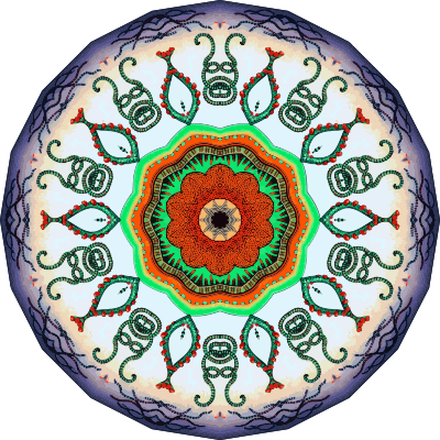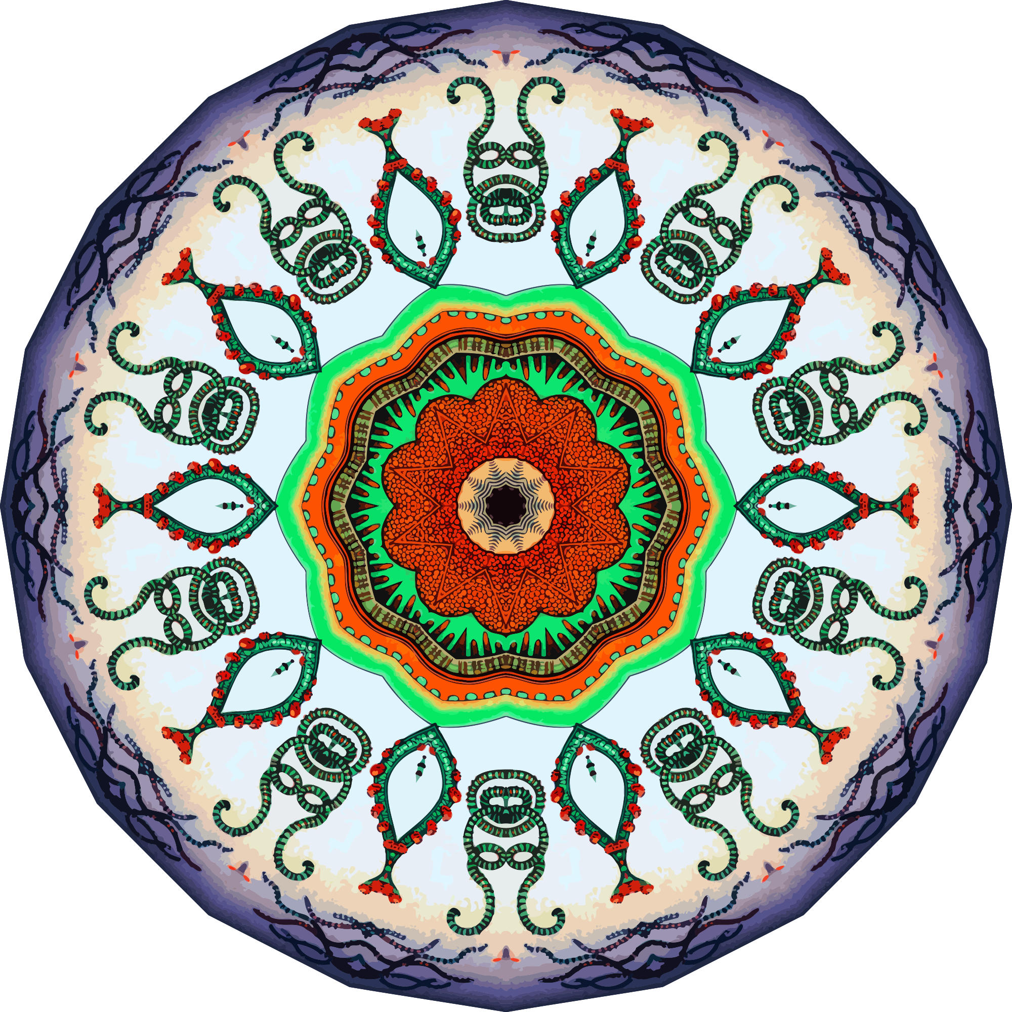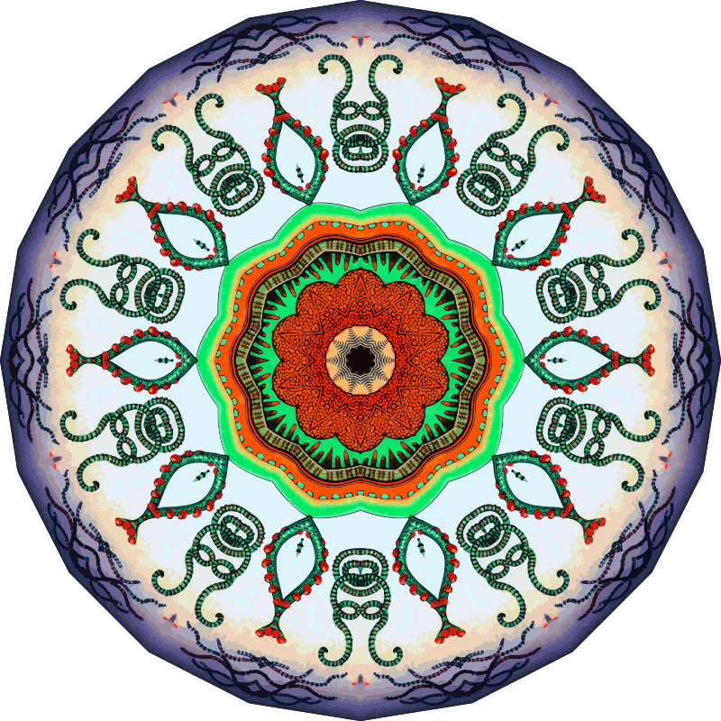 A design with approximate rotational symmetry formed from a drawing of marine coelenterates by Ernst Haeckel. The design was drawn as a PNG in Paint.net by repeated rotation of wedges of the drawing around a centre point. It was vectorized in Vector Magic