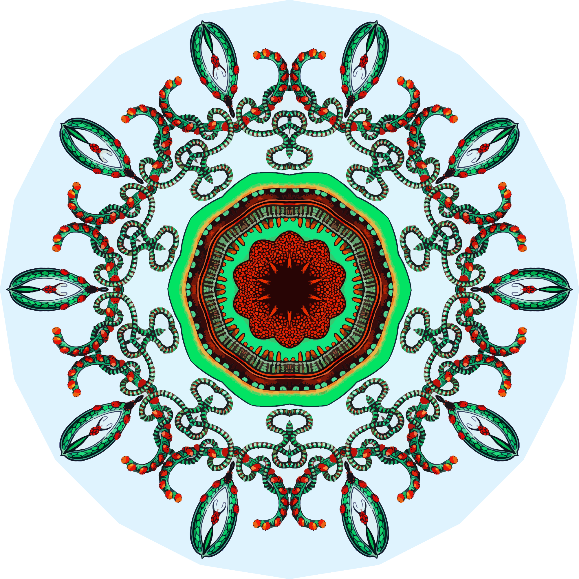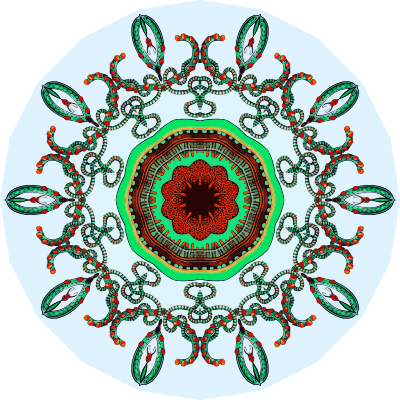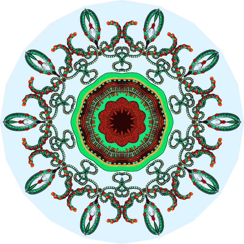 A design with approximate rotational symmetry formed from a drawing of marine coelenterates by Ernst Haeckel. The design was drawn as a PNG in Paint.net by repeated rotation of wedges of the drawing around a centre point. It was vectorized in Vector Magic
