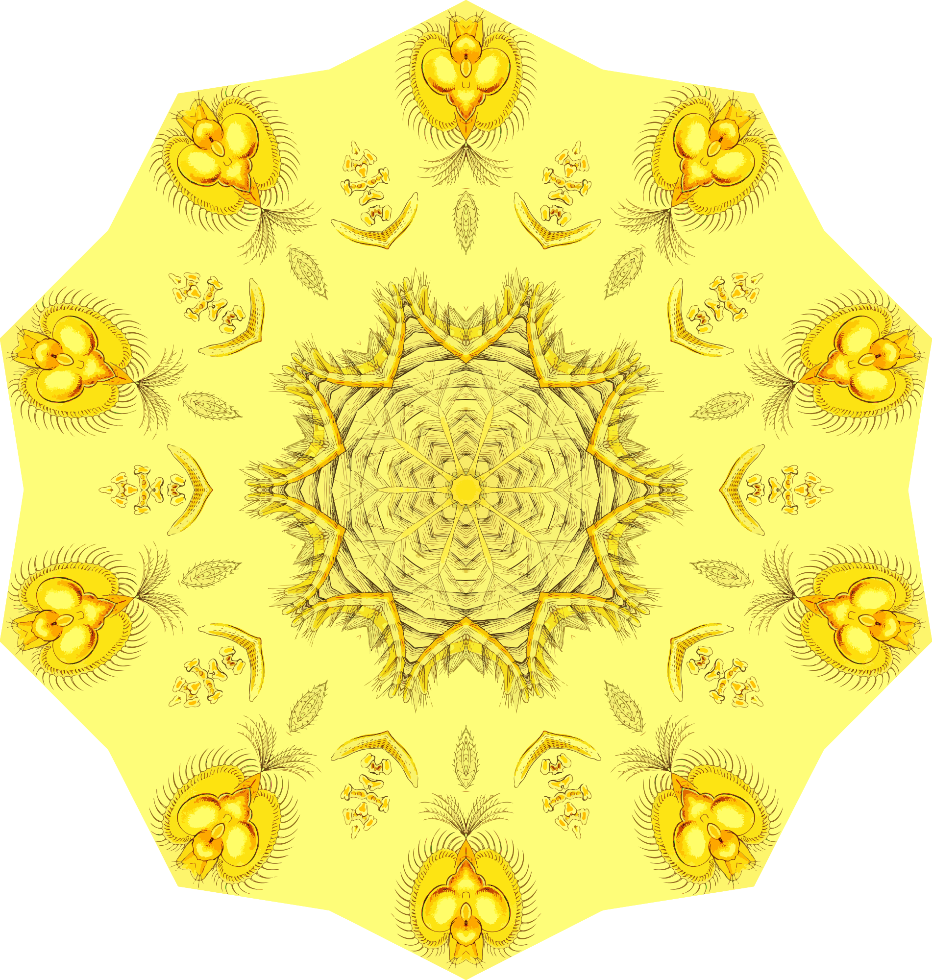 A design with approximate rotational symmetry formed from a drawing by Ernst Haeckel. The design was drawn as a PNG in Paint.net by repeated rotation of wedges of the drawing around a centre point. It was vectorized in Vector Magic