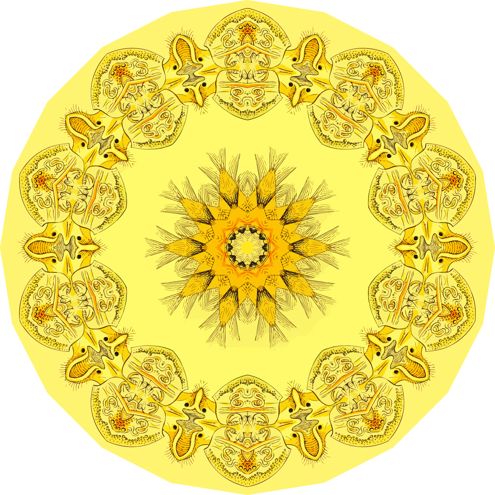 A design with approximate rotational symmetry formed from a drawing by Ernst Haeckel. The design was drawn as a PNG in Paint.net by repeated rotation of wedges of the drawing around a centre point. It was vectorized in Vector Magic