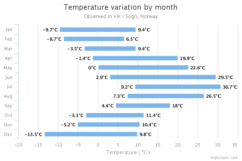 Chart showing the range of temperatures, by month, for Sogo, Norway.