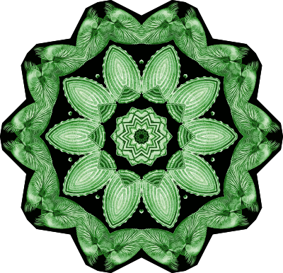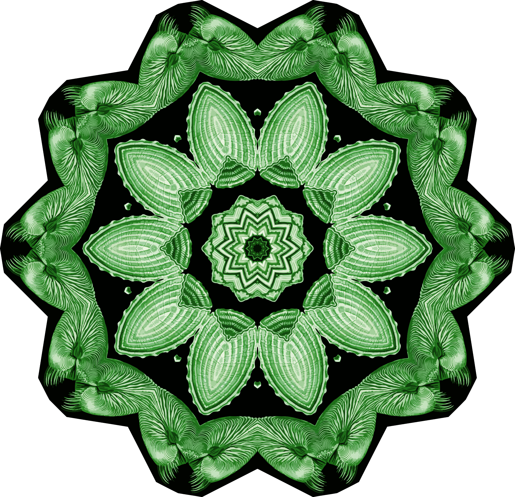 A design with approximate rotational symmetry formed from a drawing of bivalve molluscs by Ernst Haeckel. The design was drawn as a PNG in Paint.net by repeated rotation of wedges of the drawing around a centre point. It was vectorized in Vector Magic