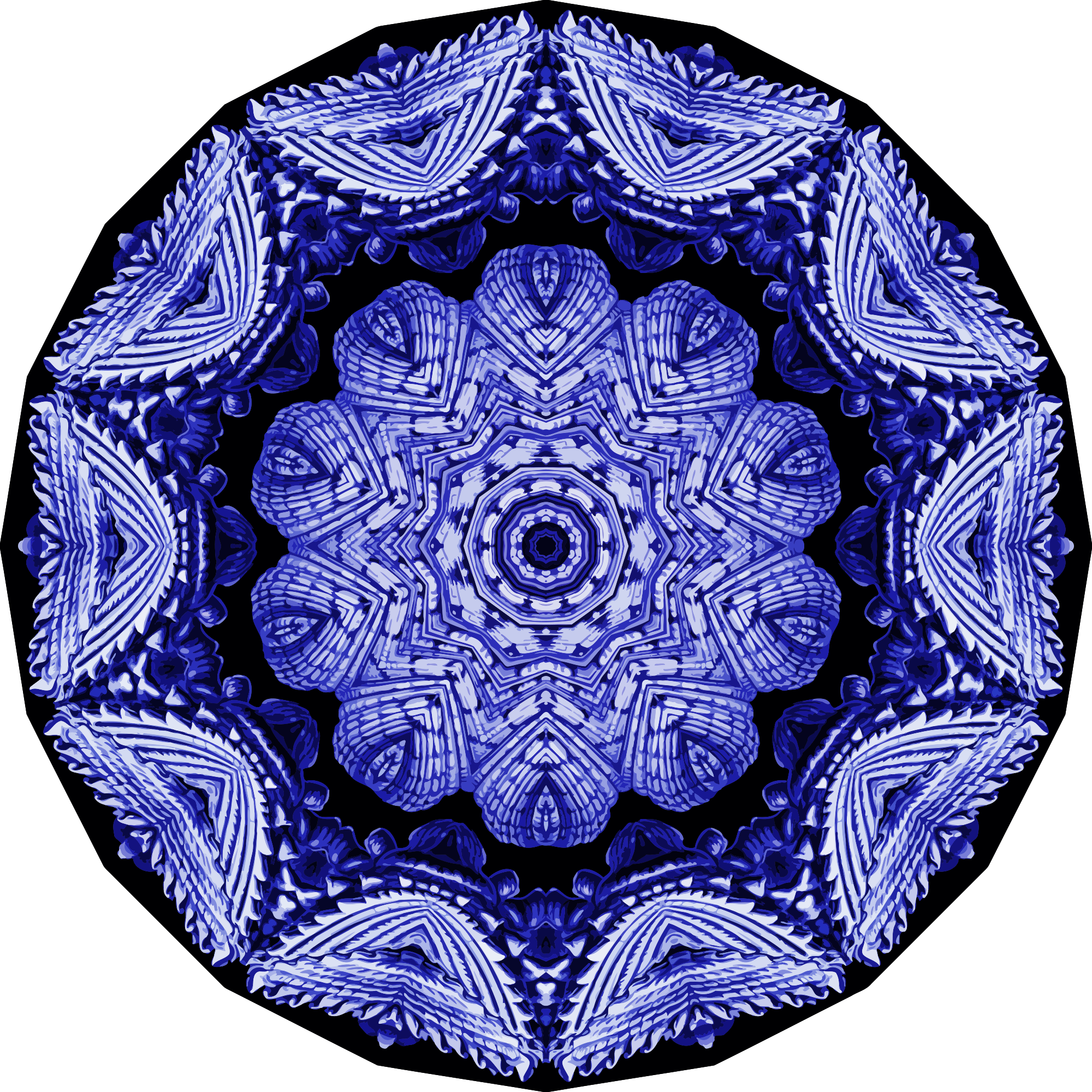 A design with approximate rotational symmetry formed from a drawing of bivalve molluscs by Ernst Haeckel. The design was drawn as a PNG in Paint.net by repeated rotation of wedges of the drawing around a centre point. It was vectorized in Vector Magic