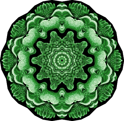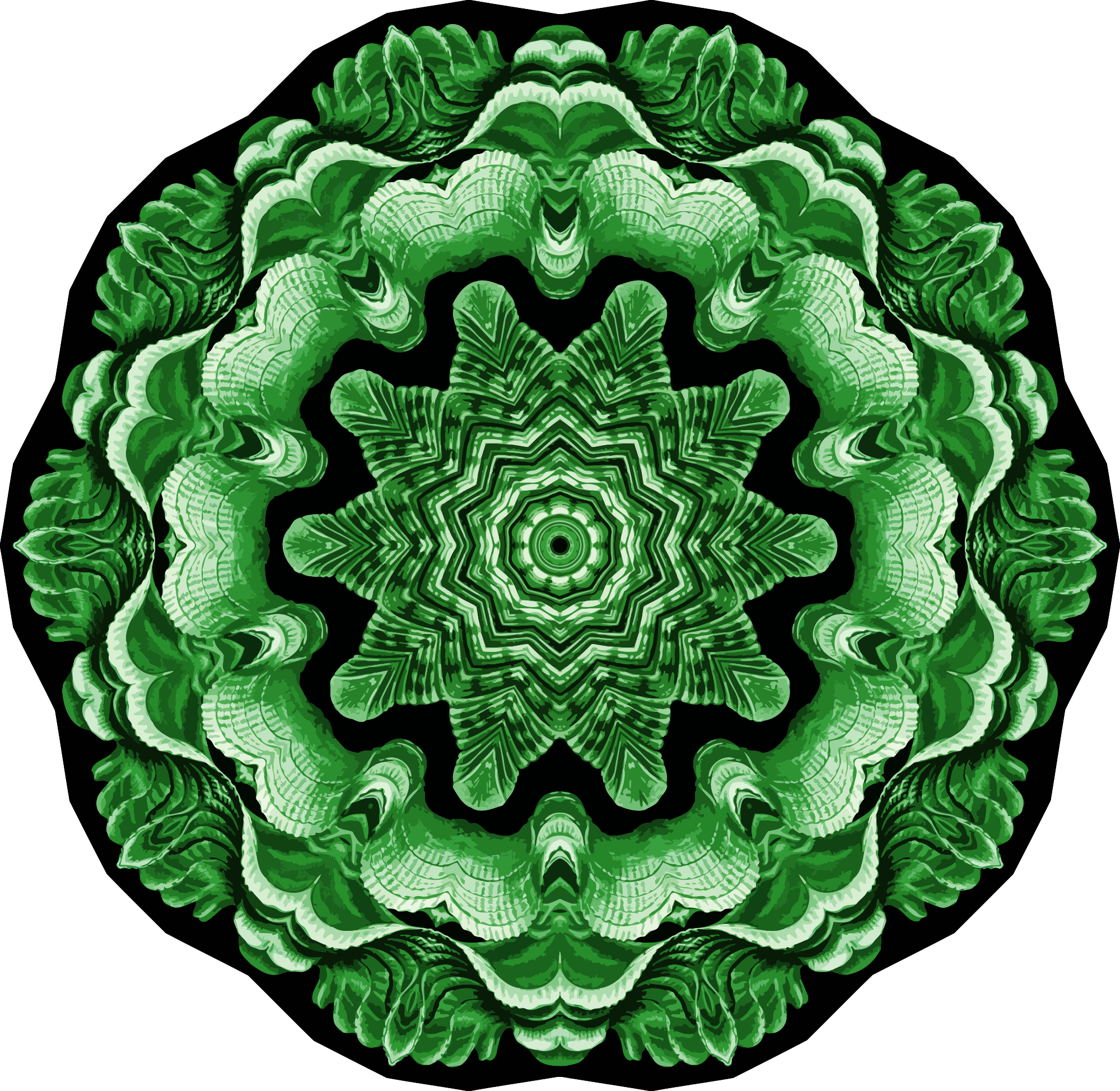 A design with approximate rotational symmetry formed from a drawing of bivalve molluscs by Ernst Haeckel. The design was drawn as a PNG in Paint.net by repeated rotation of wedges of the drawing around a centre point. It was vectorized in Vector Magic