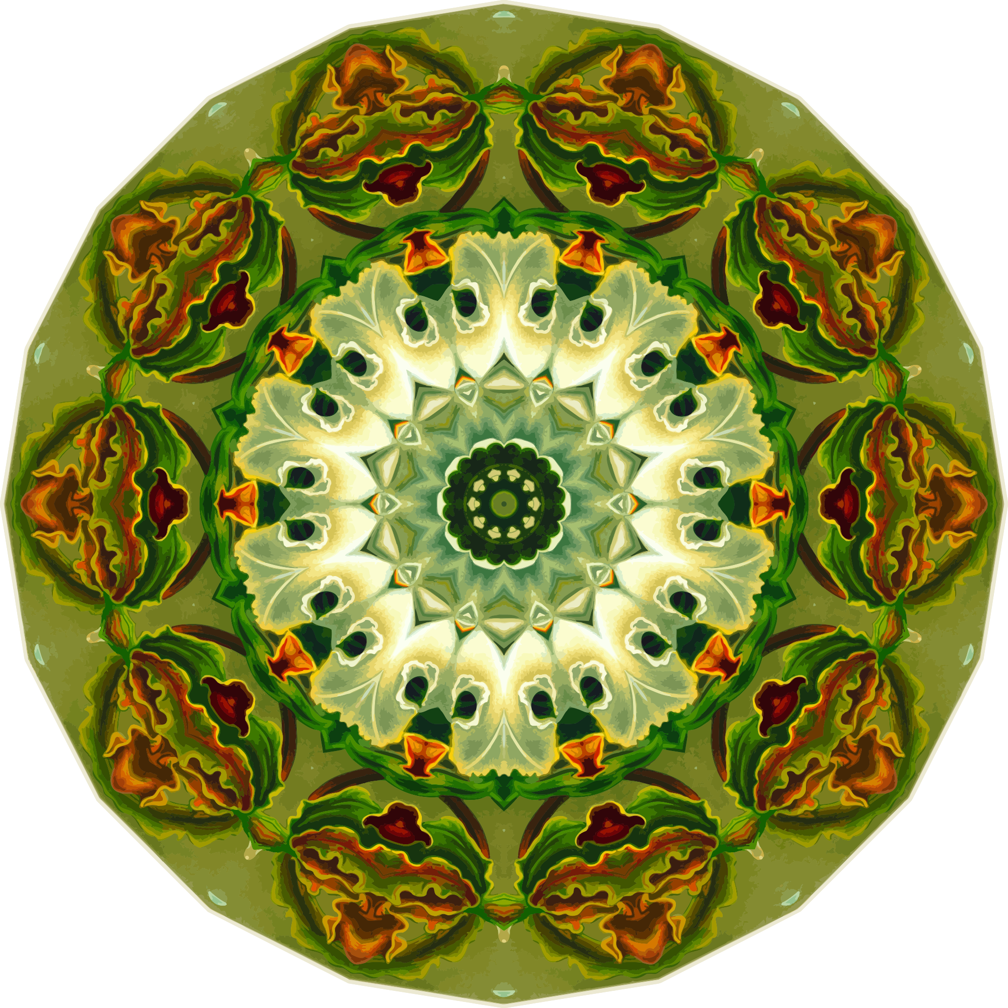 A design with approximate rotational symmetry formed from a drawing of orchids by Ernst Haeckel. The design was drawn as a PNG in Paint.net by repeated rotation of wedges of the drawing around a centre point. It was vectorized in Vector Magic