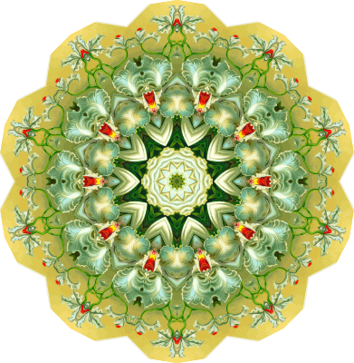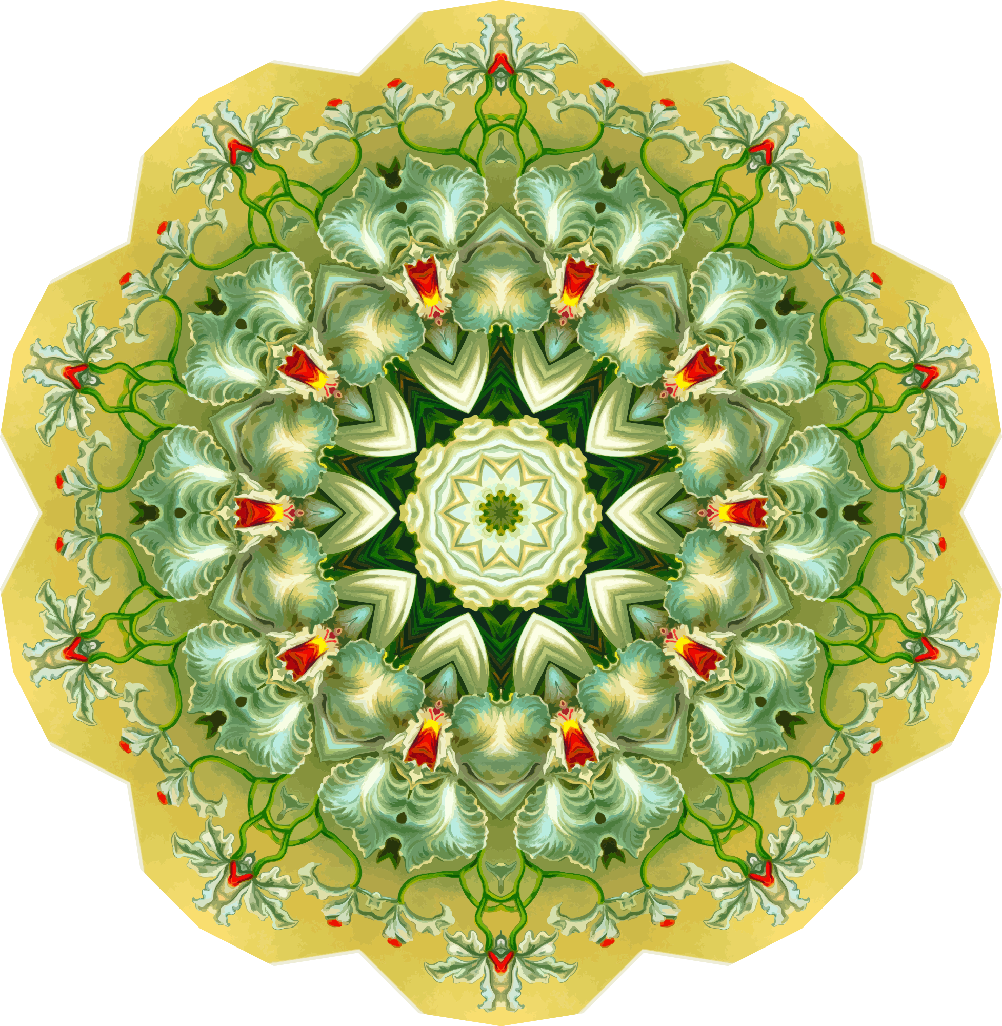 A design with approximate rotational symmetry formed from a drawing of orchids by Ernst Haeckel. The design was drawn as a PNG in Paint.net by repeated rotation of wedges of the drawing around a centre point. It was vectorized in Vector Magic