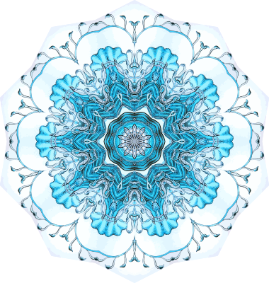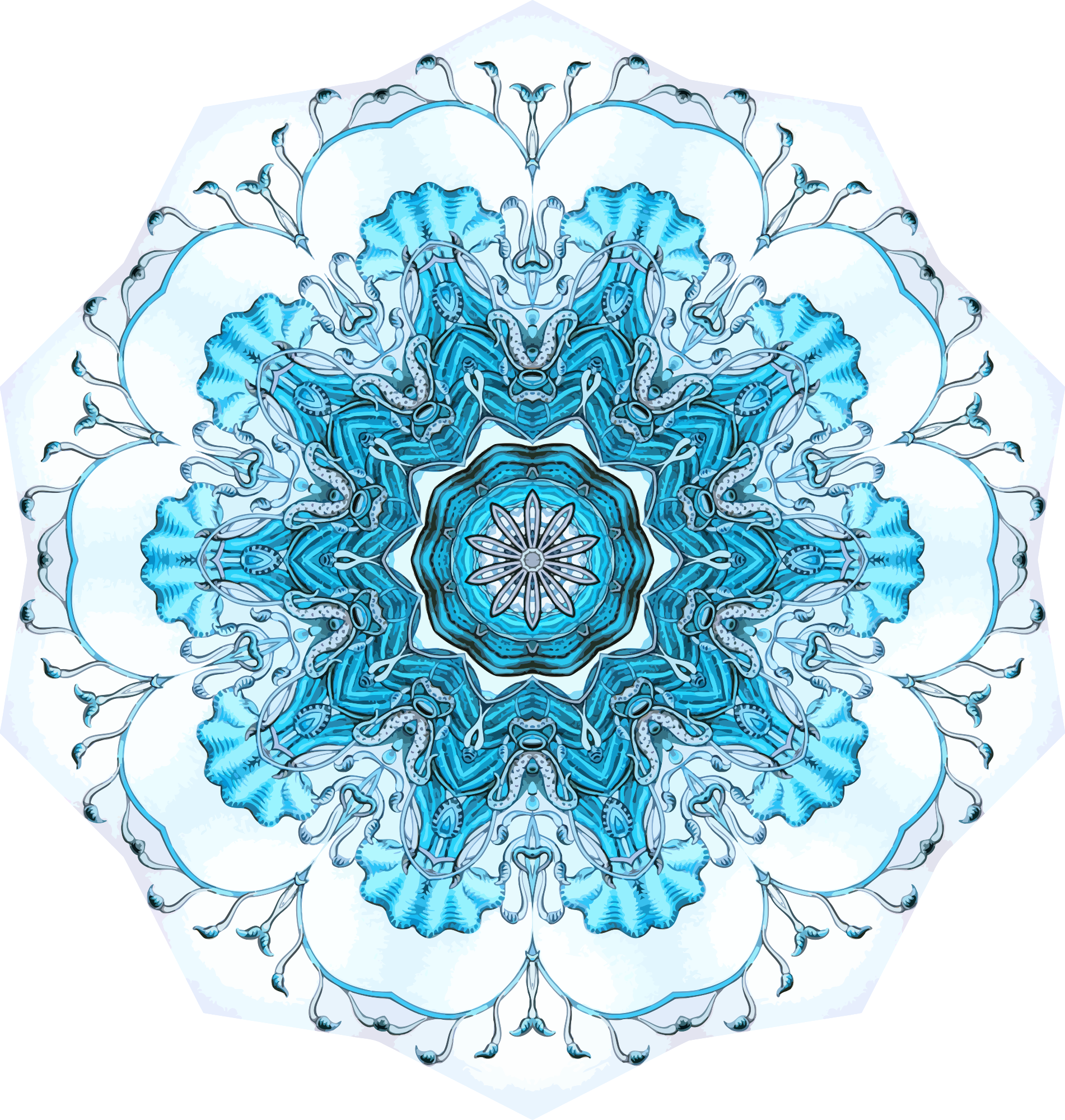 A design with approximate rotational symmetry formed from a drawing of hydrozoa by Ernst Haeckel. The design was drawn as a PNG in Paint.net by repeated rotation of wedges of the drawing around a centre point. It was vectorized in Vector Magic