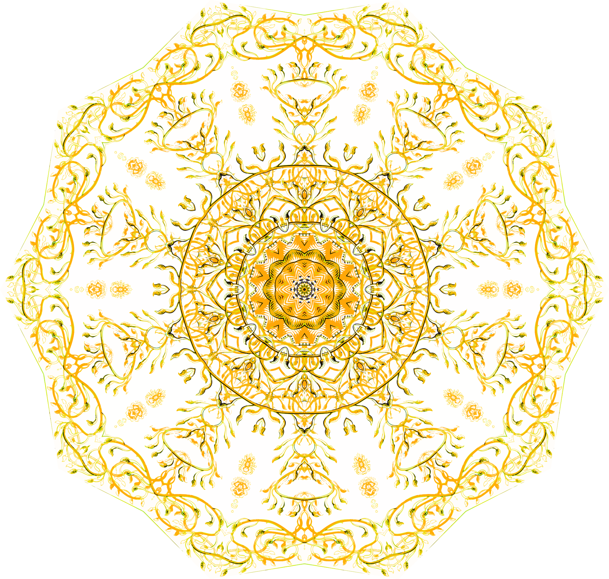 A design with approximate rotational symmetry formed from a drawing of hydrozoa by Ernst Haeckel. The design was drawn as a PNG in Paint.net by repeated rotation of wedges of the drawing around a centre point. It was vectorized in Vector Magic