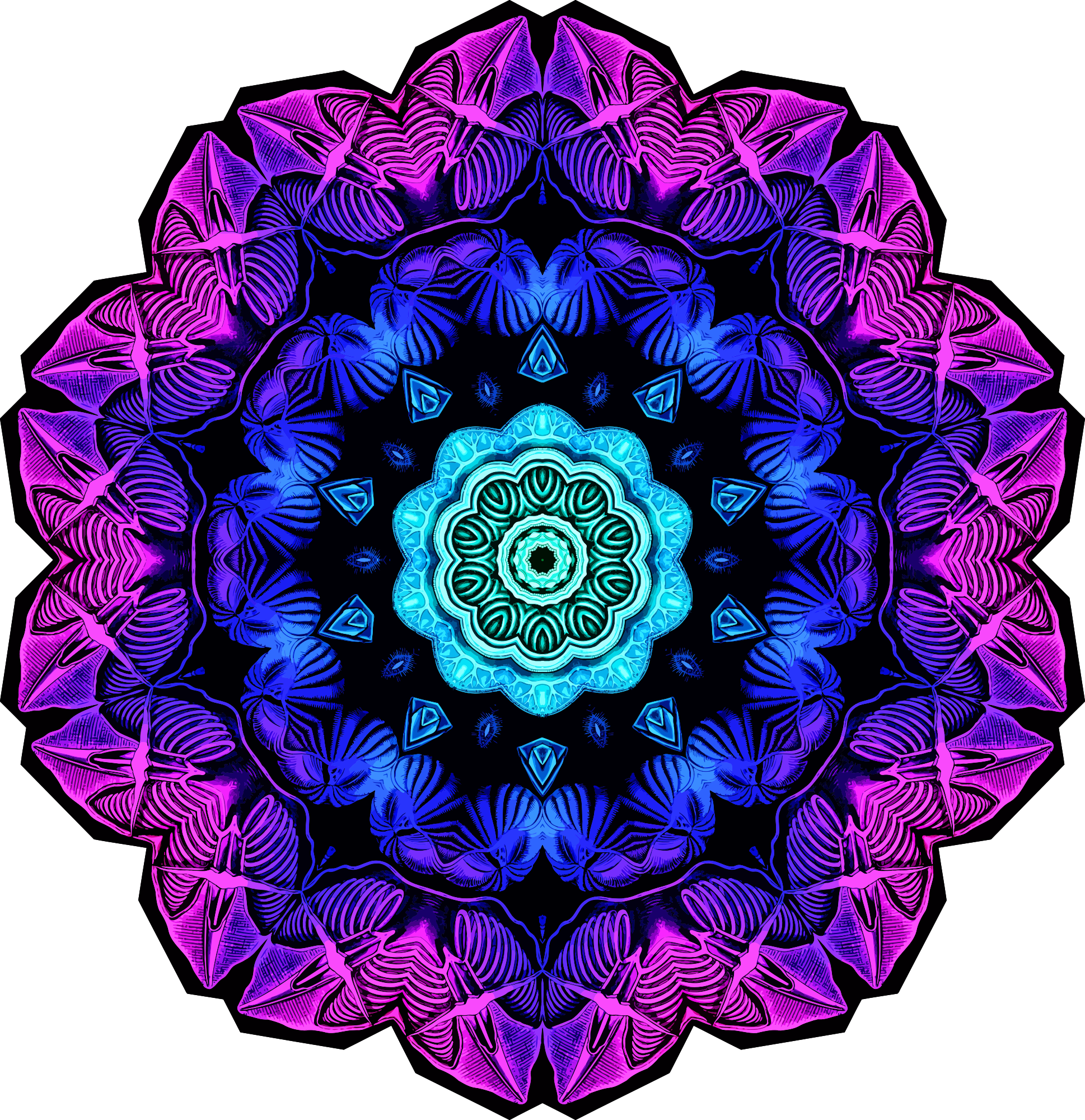 A design with approximate rotational symmetry formed from a drawing of annelid fanworms by Ernst Haeckel. The design was drawn as a PNG in Paint.net by repeated rotation of wedges of the drawing around a centre point. It was vectorized in Vector Magic