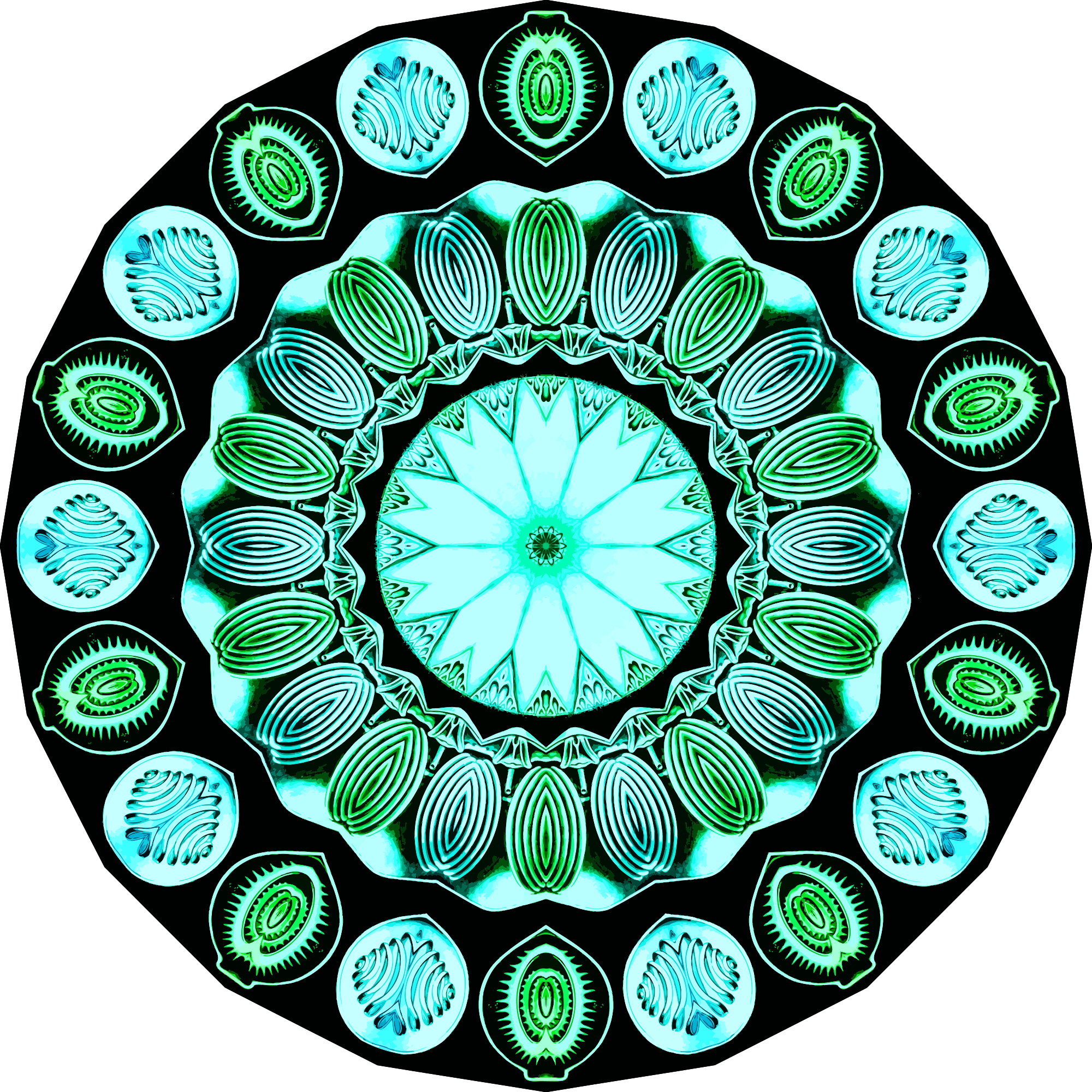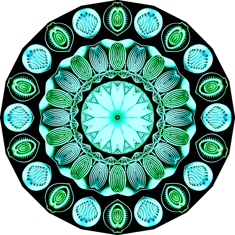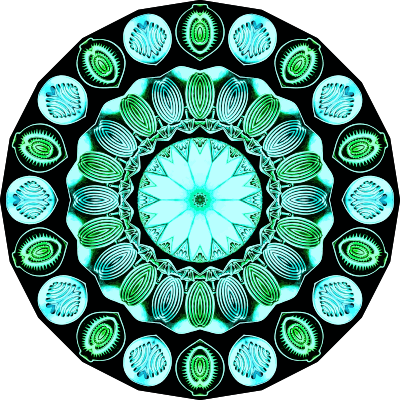 A design with approximate rotational symmetry formed from a drawing of annelid fanworms by Ernst Haeckel. The design was drawn as a PNG in Paint.net by repeated rotation of wedges of the drawing around a centre point. It was vectorized in Vector Magic