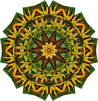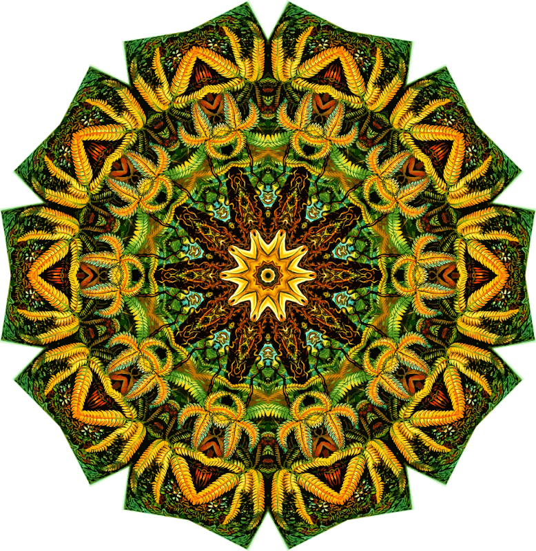 A design with approximate rotational symmetry formed from a drawing of ferns by Ernst Haeckel. The design was drawn as a PNG in Paint.net by repeated rotation of wedges of the drawing around a centre point. It was vectorized in Vector Magic