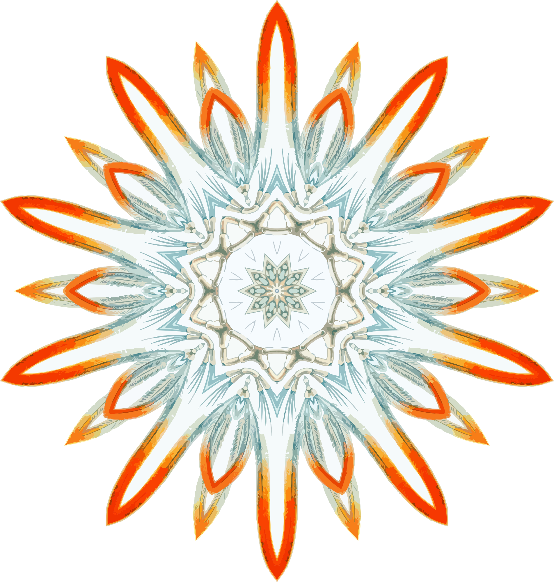 A design with approximate rotational symmetry formed from a drawing of crustaceans by Ernst Haeckel. The design was drawn as a PNG in Paint.net by repeated rotation of wedges of the drawing around a centre point. It was vectorized in Vector Magic