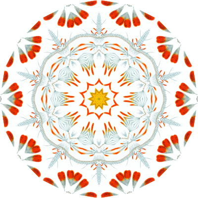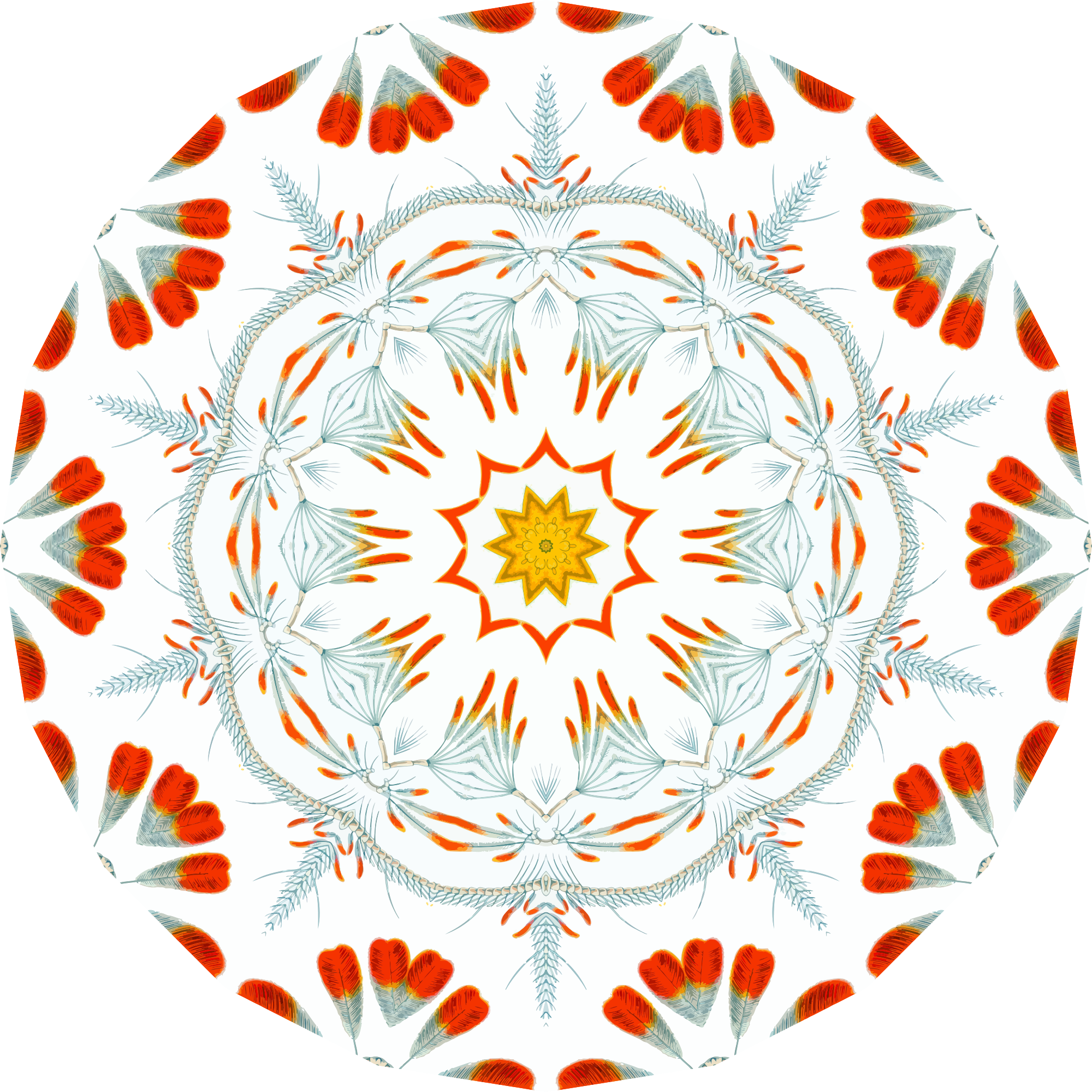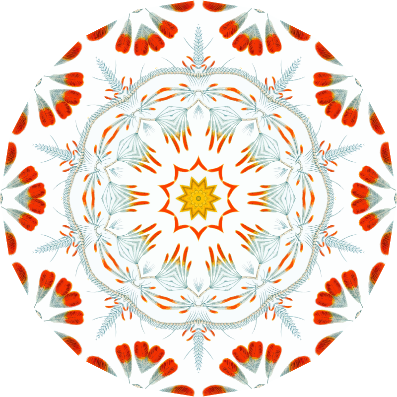 A design with approximate rotational symmetry formed from a drawing of crustaceans by Ernst Haeckel. The design was drawn as a PNG in Paint.net by repeated rotation of wedges of the drawing around a centre point. It was vectorized in Vector Magic