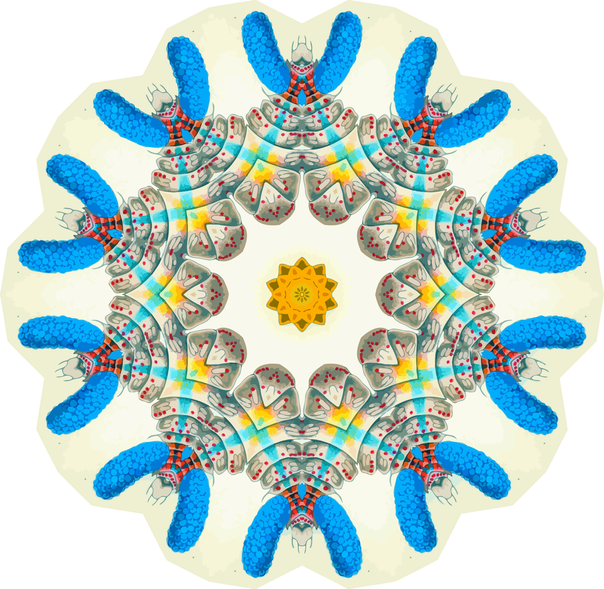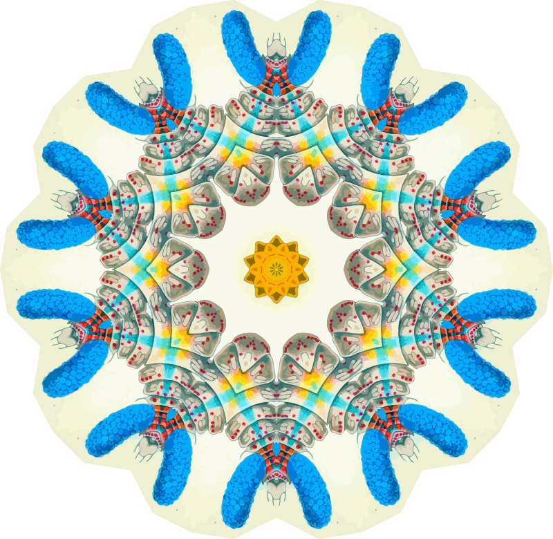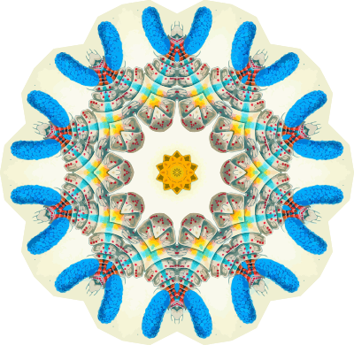 A design with approximate rotational symmetry formed from a drawing of crustaceans by Ernst Haeckel. The design was drawn as a PNG in Paint.net by repeated rotation of wedges of the drawing around a centre point. It was vectorized in Vector Magic