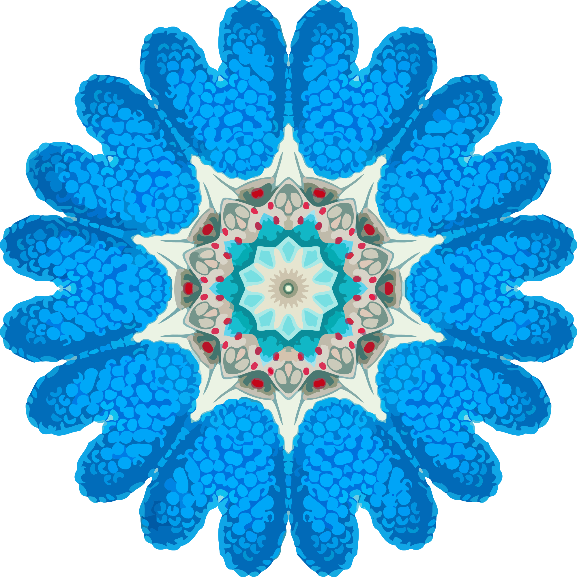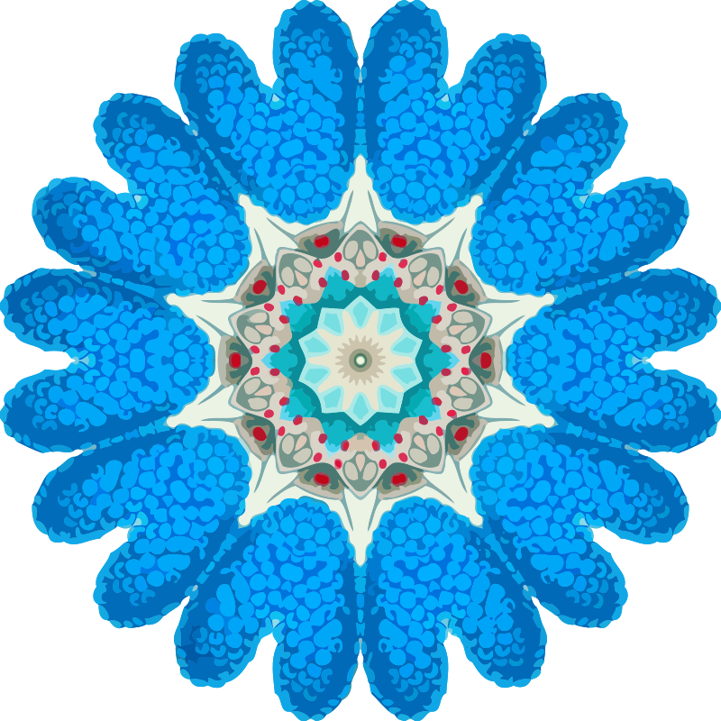 A design with approximate rotational symmetry formed from a drawing of crustaceans by Ernst Haeckel. The design was drawn as a PNG in Paint.net by repeated rotation of wedges of the drawing around a centre point. It was vectorized in Vector Magic
