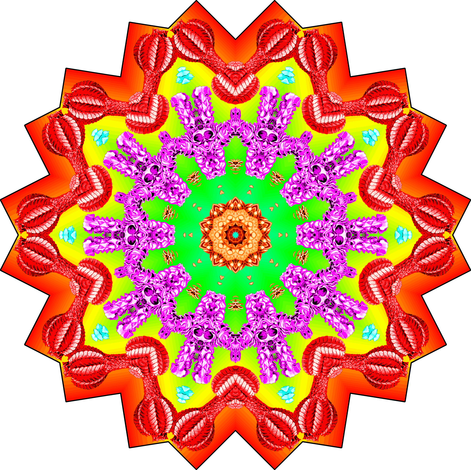 A design with approximate rotational symmetry formed from a wildlife drawing by Ernst Haeckel with freaky added colour. The design was drawn as a PNG in Paint.net by repeated rotation of wedges of the drawing around a centre point. It was vectorized in Vector Magic