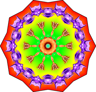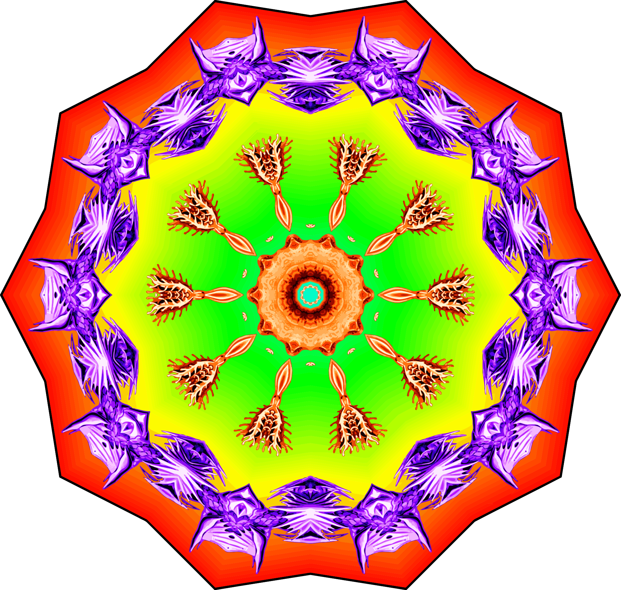A design with approximate rotational symmetry formed from a wildlife drawing by Ernst Haeckel with freaky added colour. The design was drawn as a PNG in Paint.net by repeated rotation of wedges of the drawing around a centre point. It was vectorized in Vector Magic