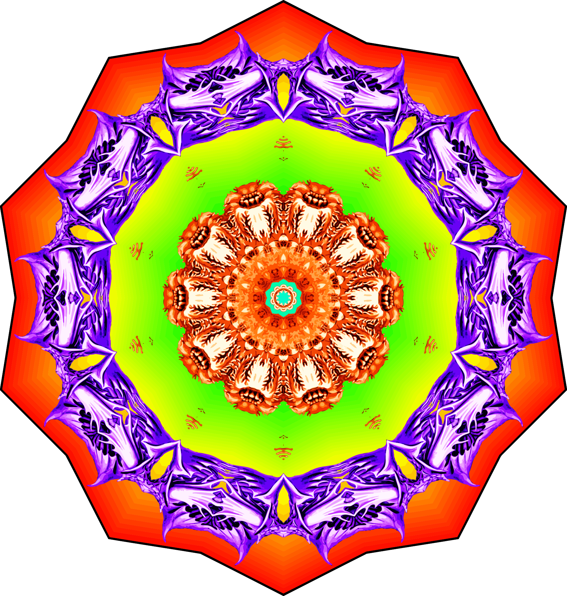 A design with approximate rotational symmetry formed from a wildlife drawing by Ernst Haeckel with freaky added colour. The design was drawn as a PNG in Paint.net by repeated rotation of wedges of the drawing around a centre point. It was vectorized in Vector Magic
