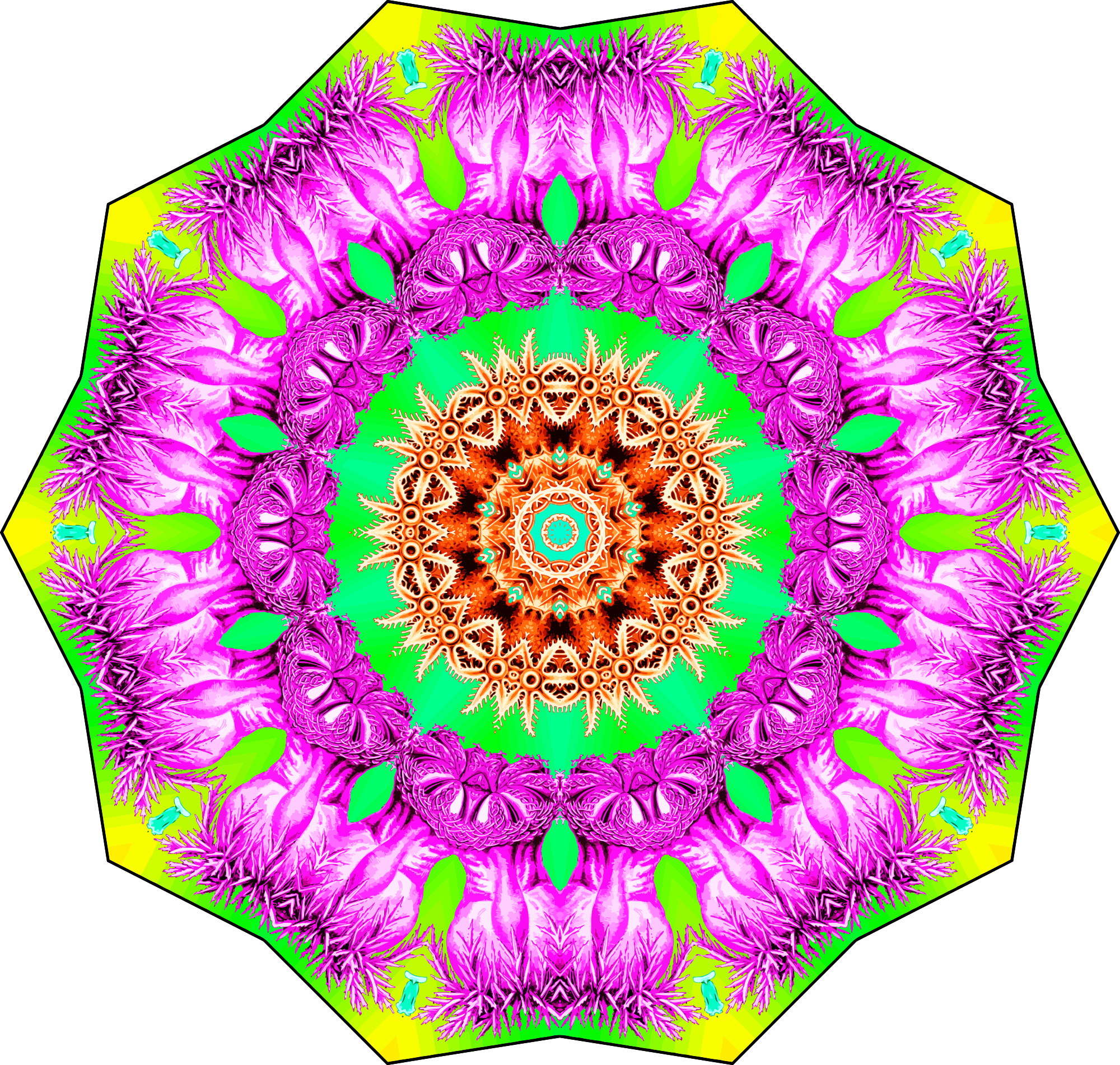 A design with approximate rotational symmetry formed from a wildlife drawing by Ernst Haeckel with freaky added colour. The design was drawn as a PNG in Paint.net by repeated rotation of wedges of the drawing around a centre point. It was vectorized in Vector Magic