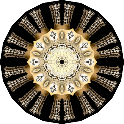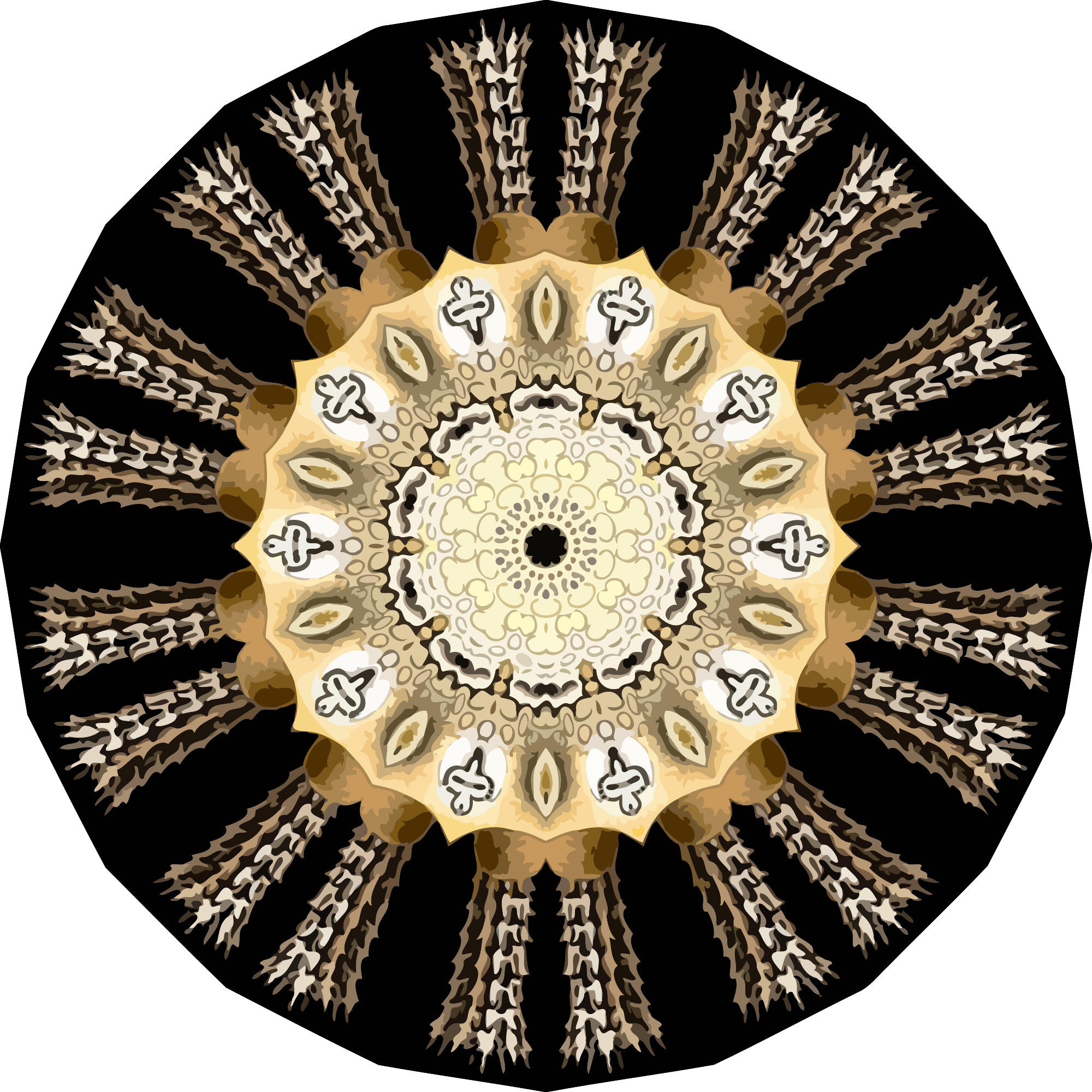 A design with approximate rotational symmetry formed from a drawing of marine invertebrates by Ernst Haeckel. The design was drawn as a PNG in Paint.net by repeated rotation of wedges of the drawing around a centre point. It was vectorized in Vector Magic