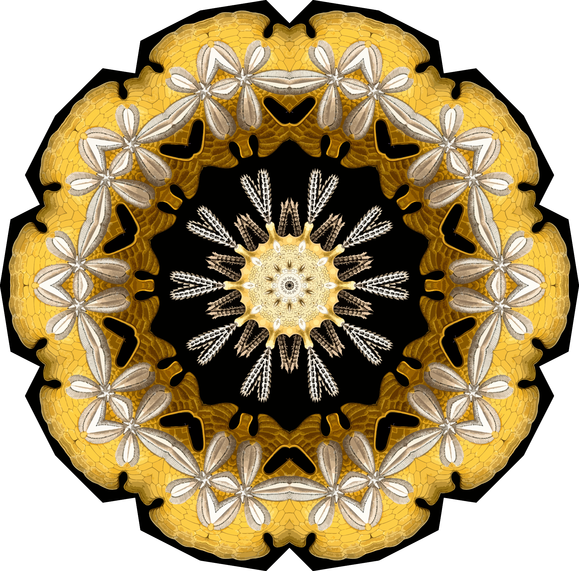 A design with approximate rotational symmetry formed from a drawing of marine invertebrates by Ernst Haeckel. The design was drawn as a PNG in Paint.net by repeated rotation of wedges of the drawing around a centre point. It was vectorized in Vector Magic