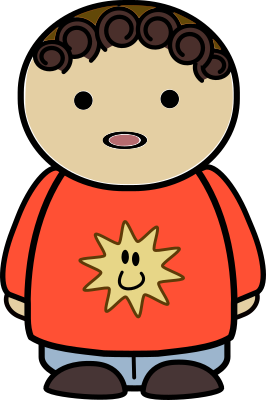 Front view of surprised brown-haired boy in jeans and an orange shirt with a smiling star on front.