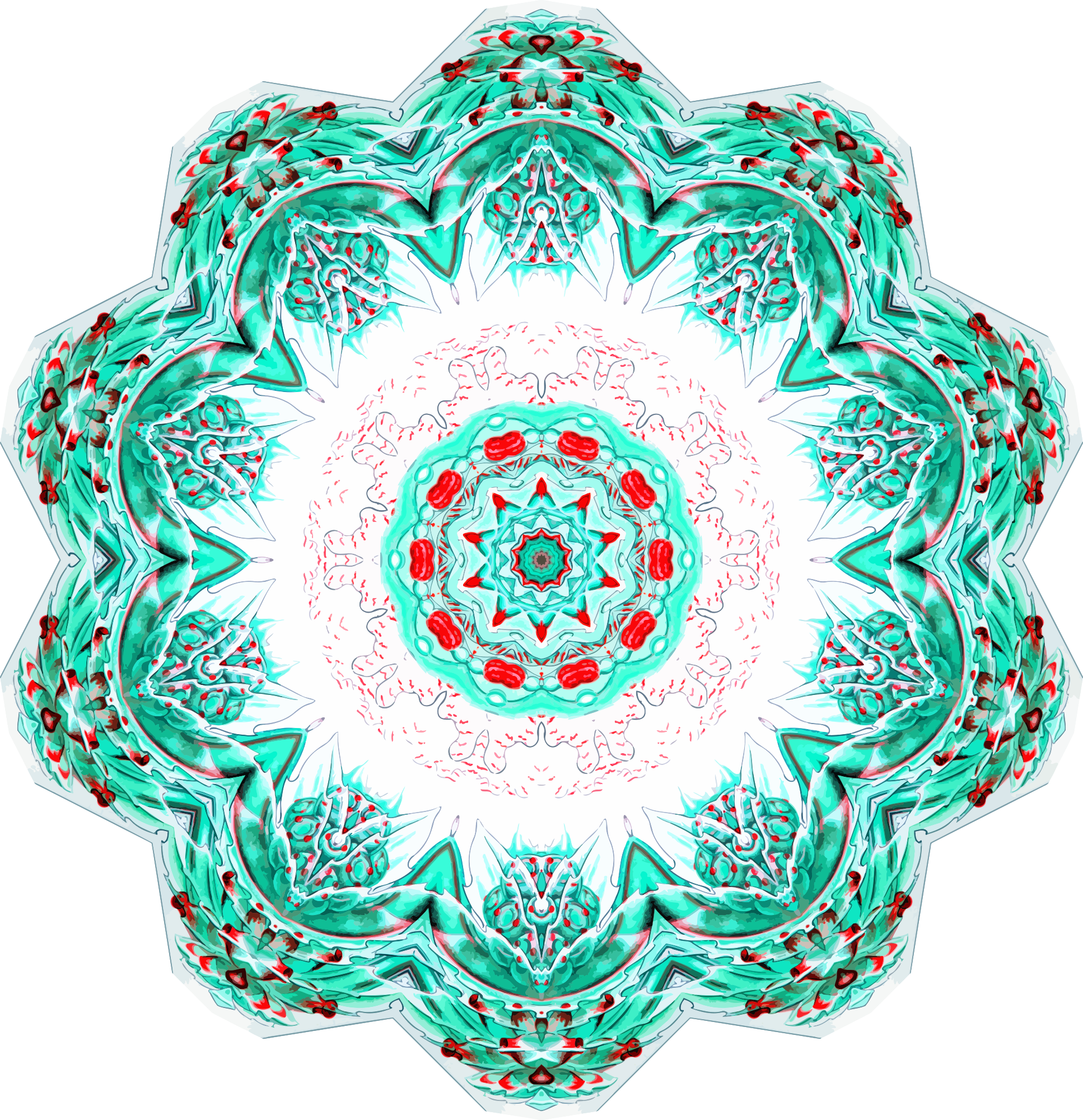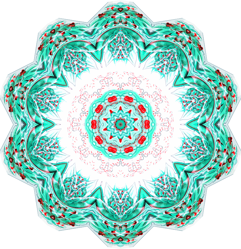 A design with approximate rotational symmetry formed from a drawing of hydrozoa by Ernst Haeckel. The design was drawn as a PNG in Paint.net by repeated rotation of wedges of the drawing around a centre point. It was vectorized in Vector Magic