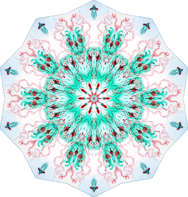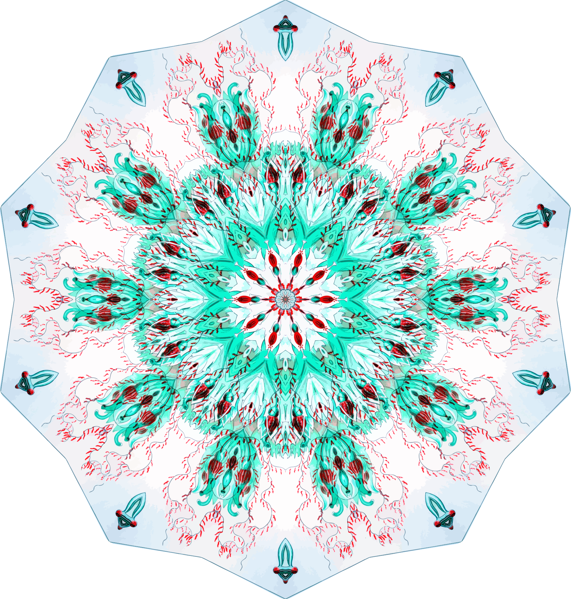 A design with approximate rotational symmetry formed from a drawing of hydrozoa by Ernst Haeckel. The design was drawn as a PNG in Paint.net by repeated rotation of wedges of the drawing around a centre point. It was vectorized in Vector Magic