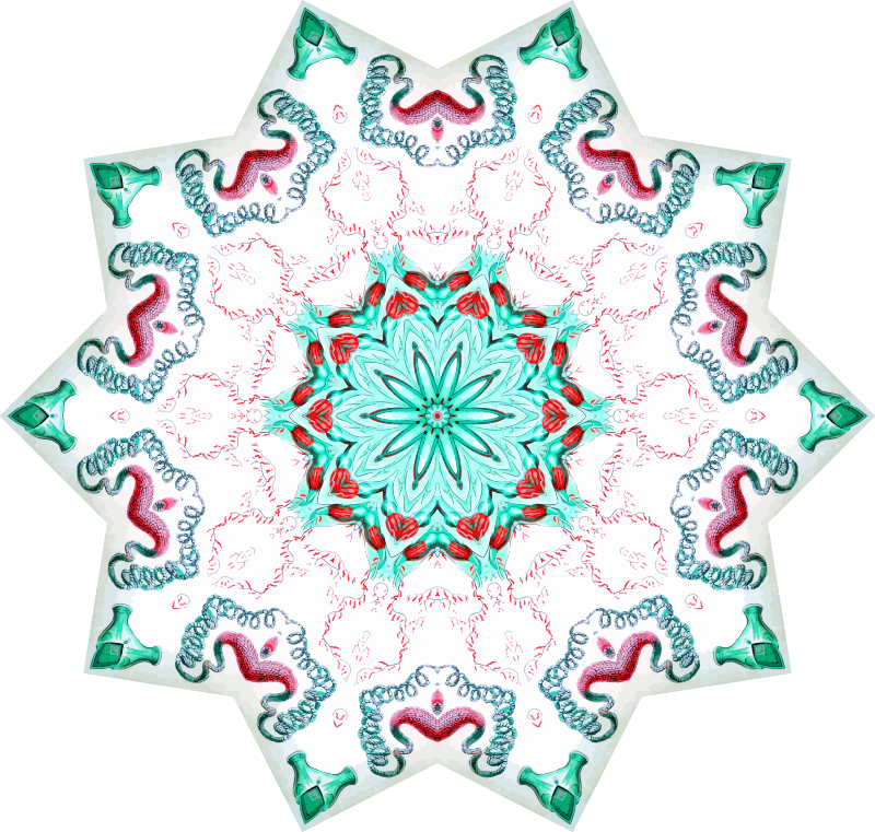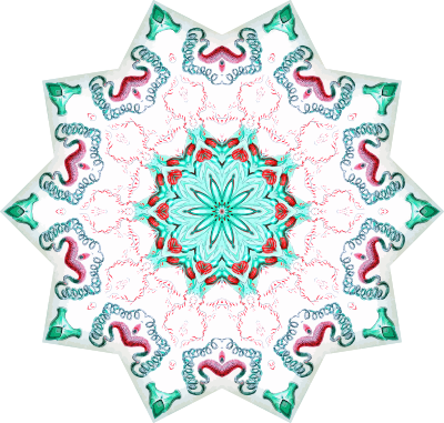 A design with approximate rotational symmetry formed from a drawing of hydrozoa by Ernst Haeckel. The design was drawn as a PNG in Paint.net by repeated rotation of wedges of the drawing around a centre point. It was vectorized in Vector Magic