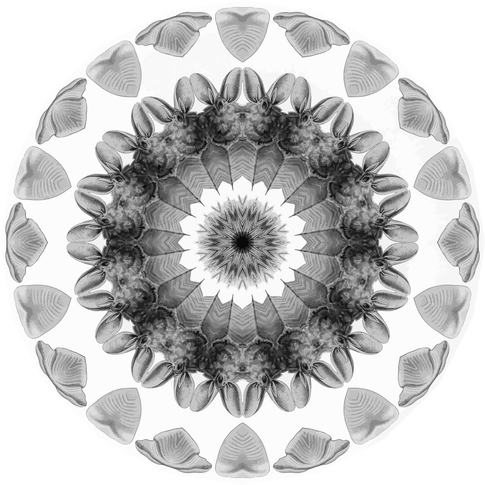 A design with approximate rotational symmetry formed from a drawing of bats by Ernst Haeckel. The design was drawn as a PNG in Paint.net by repeated rotation of wedges of the drawing around a centre point. It was vectorized in Vector Magic