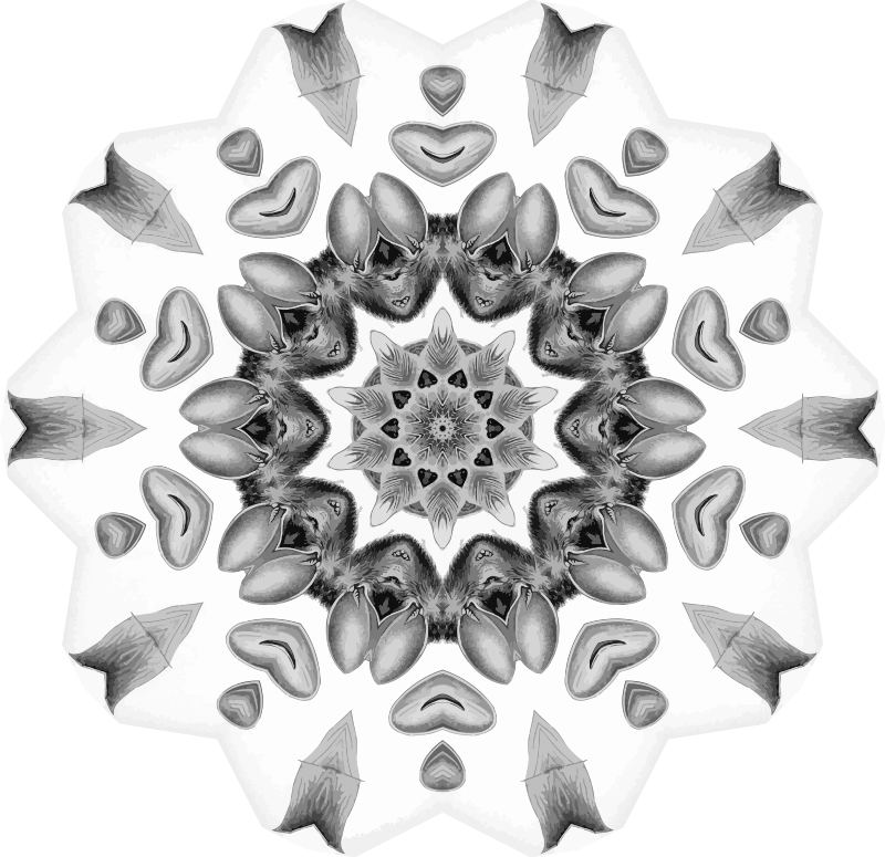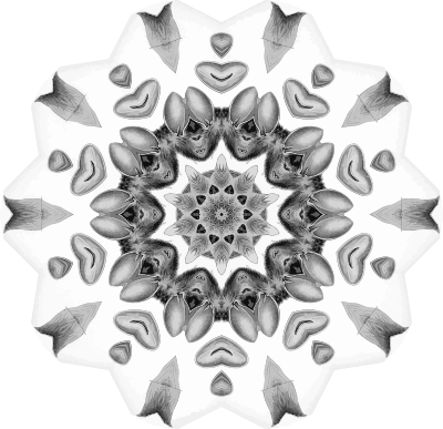 A design with approximate rotational symmetry formed from a drawing of bats by Ernst Haeckel. The design was drawn as a PNG in Paint.net by repeated rotation of wedges of the drawing around a centre point. It was vectorized in Vector Magic