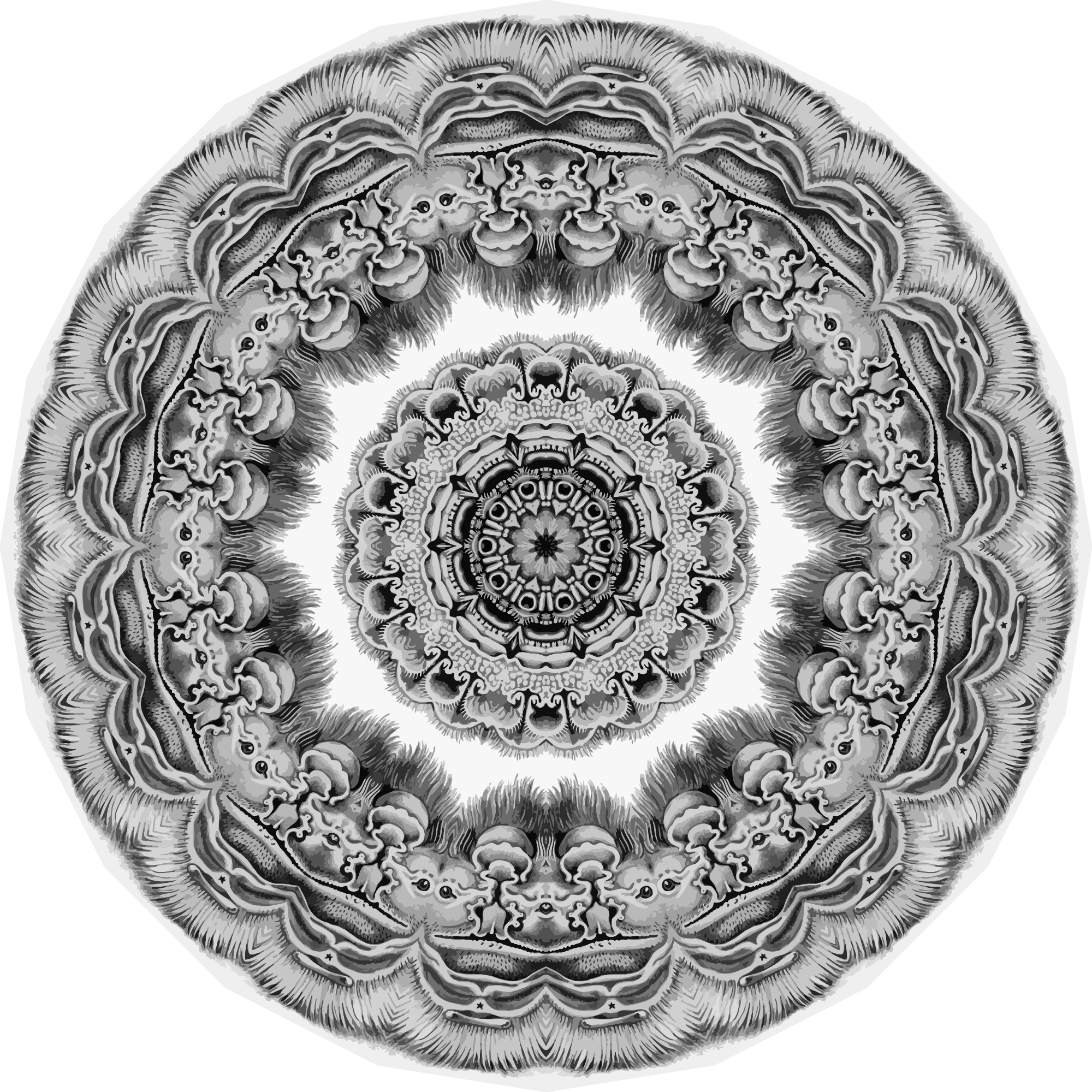 A design with approximate rotational symmetry formed from a drawing of bats by Ernst Haeckel. The design was drawn as a PNG in Paint.net by repeated rotation of wedges of the drawing around a centre point. It was vectorized in Vector Magic