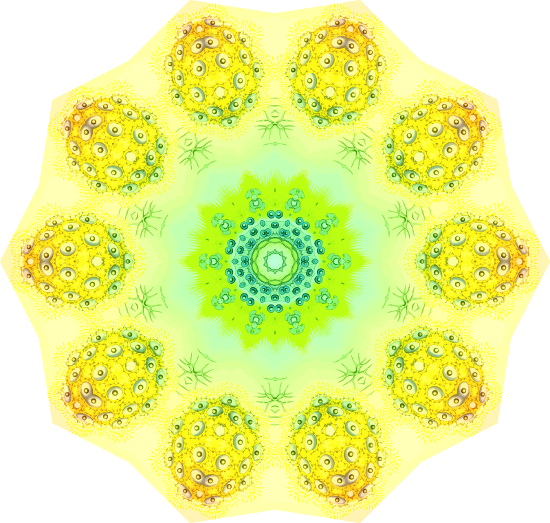 A design with approximate rotational symmetry formed from a drawing of radiolaria by Ernst Haeckel. The design was drawn as a PNG in Paint.net by repeated rotation of wedges of the drawing around a centre point. It was vectorized in Vector Magic