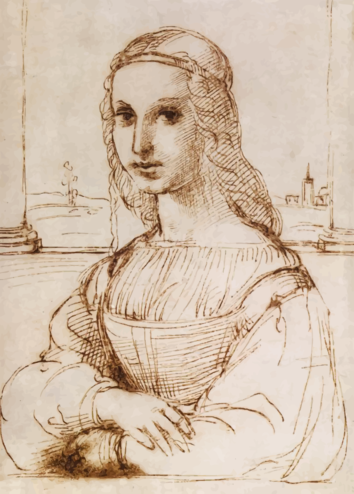 From an image on Wikimedia Commons. Raphael's 'Young Woman on a Balcony’ thought to be influenced by Leonardo da Vinci's Mona Lisa. Colour trace, blemishes removed.