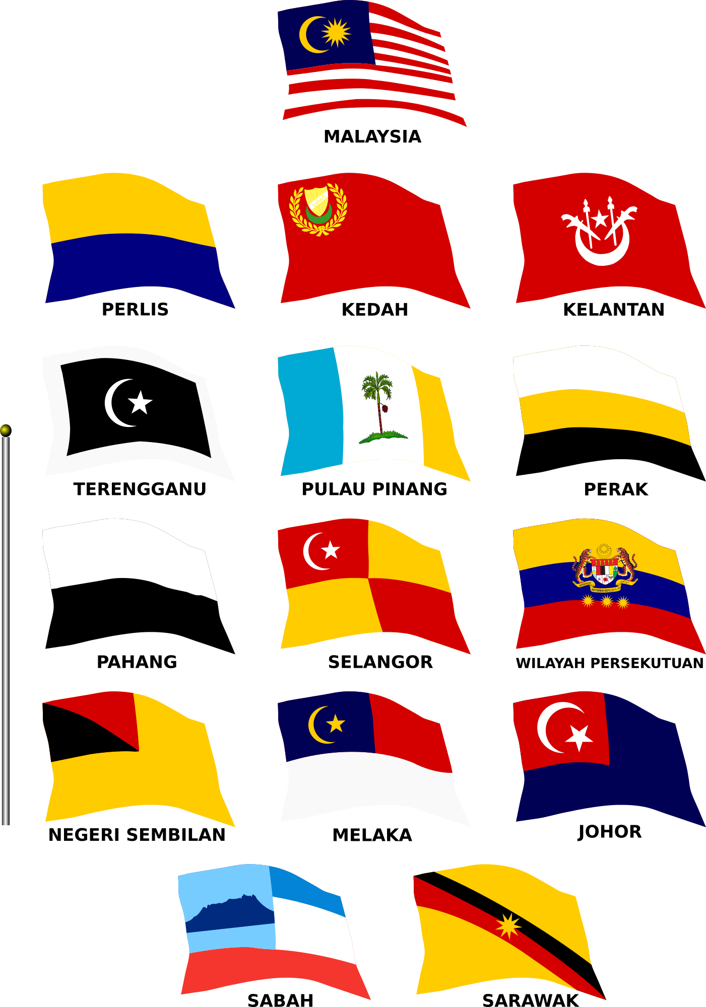 Fluttering flags of the states of Malaysia. Comes with flag pole on the left.