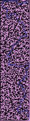 A vertical maze in purple. With a solution in blue.